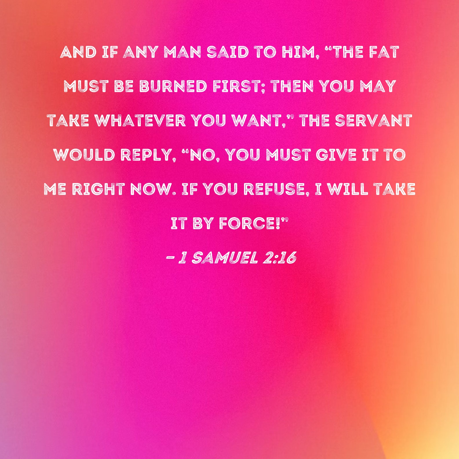 1 Samuel 2:16 And if any man said to him, "The fat must be burned first; then you may take whatever you want," the servant would reply, "No, you must give it to me right now. If you refuse, I will take it by force!"