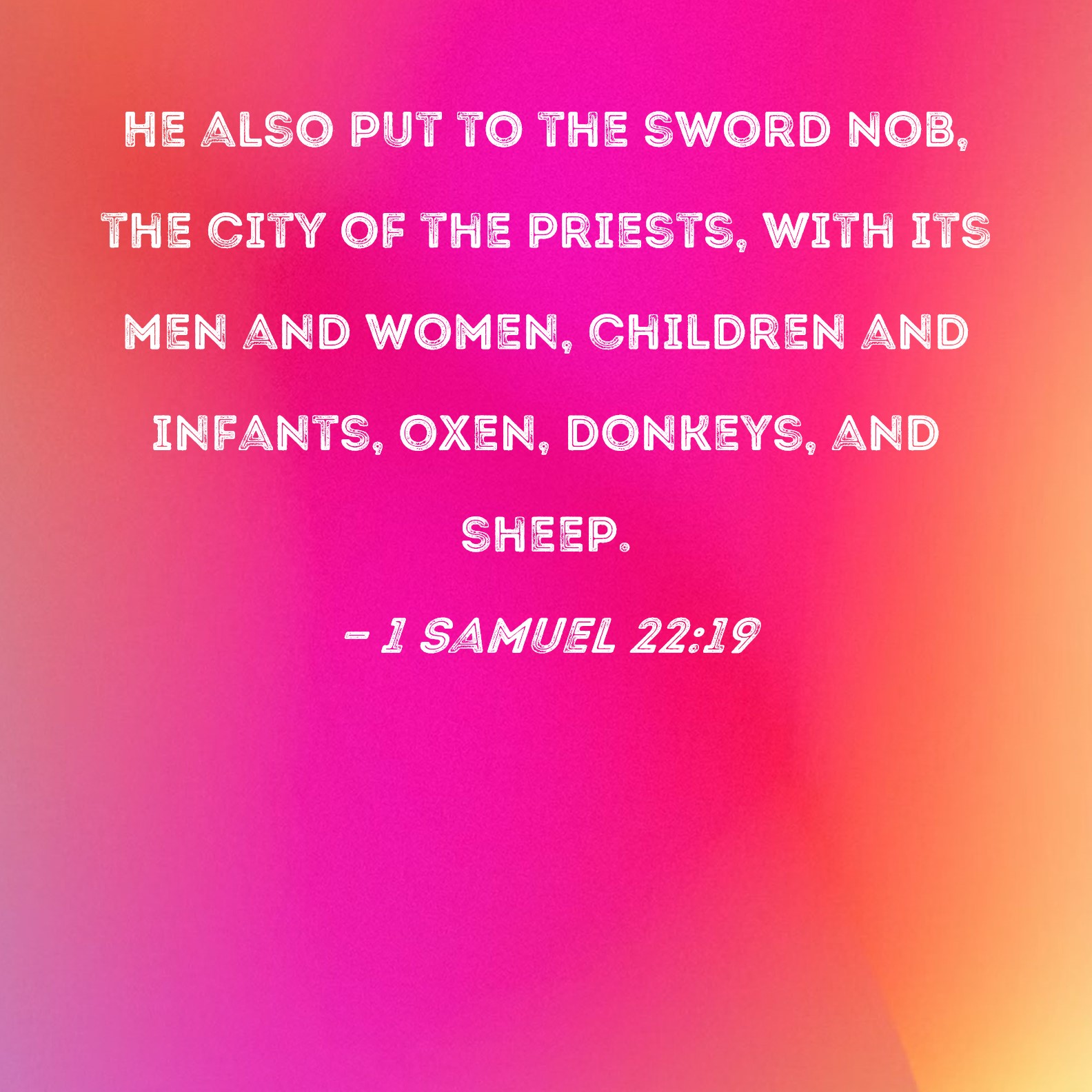BSB: He also put to the sword Nob, the city of the priests, with its men and women, children and infants, oxen, donkeys, and sheep. KJV: And Nob, the city of the priests, smote he with the edge of the sword, both men and women, children and sucklings, and oxen, and asses, and sheep, with the edge of the sword. DRB: And Nobe the city of the priests he smote with the edge of his sword, both men and women, children, and sucklings, and ox and ass, and sheep with the edge of the sword. DBT: And Nob, the city of the priests, he smote with the edge of the sword, both men and women, infants and sucklings, and oxen, and asses, and sheep, with the edge of the sword. ERV: And Nob, the city of the priests, smote he with the edge of the sword, both men and women, children and sucklings, and oxen and asses and sheep, with the edge of the sword. WBT: And Nob, the city of the priests, he smote with the edge of the sword, both men and women, children and sucklings, and oxen, and asses, and sheep, with the edge of the sword. WEB: He struck Nob, the city of the priests, with the edge of the sword—both men and women, children and nursing babies, and cattle, donkeys, and sheep, with the edge of the sword. YLT: and Nob, the city of the priests, he hath smitten by the mouth of the sword, from man even unto woman, from infant even unto suckling, and ox, and ass, and sheep, by the mouth of the sword.Links 1 Samuel 22:19 NIV • 1 Samuel 22:19 NLT • 1 Samuel 22:19 ESV • 1 Samuel 22:19 NASB • 1 Samuel 22:19 KJV • 1 Samuel 22:19 Interlinear • 1 Samuel 22:19 Commentaries • 1 Samuel 22:19 Parallel Texts • 1 Samuel 22:19 Bible Apps • 1 Samuel 22:19 Parallel • Bible Hub |