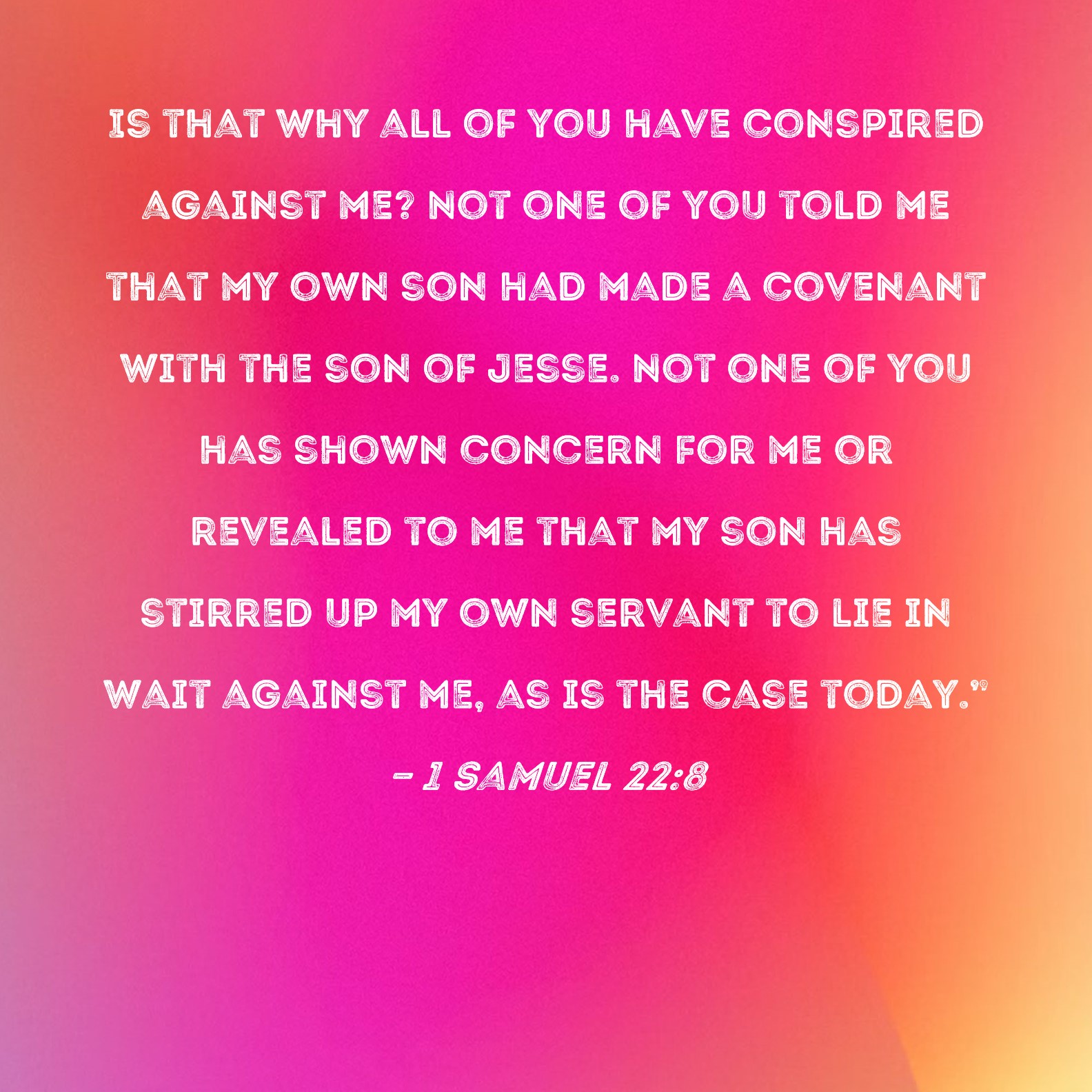 1 Samuel 22:8 Is that why all of you have conspired against me? Not one of you told me that my own son had made a covenant with the son of Jesse. Not one of you has shown concern for me or revealed to me that my son has stirred up my own servant to lie in wait against me, as is the case today."
