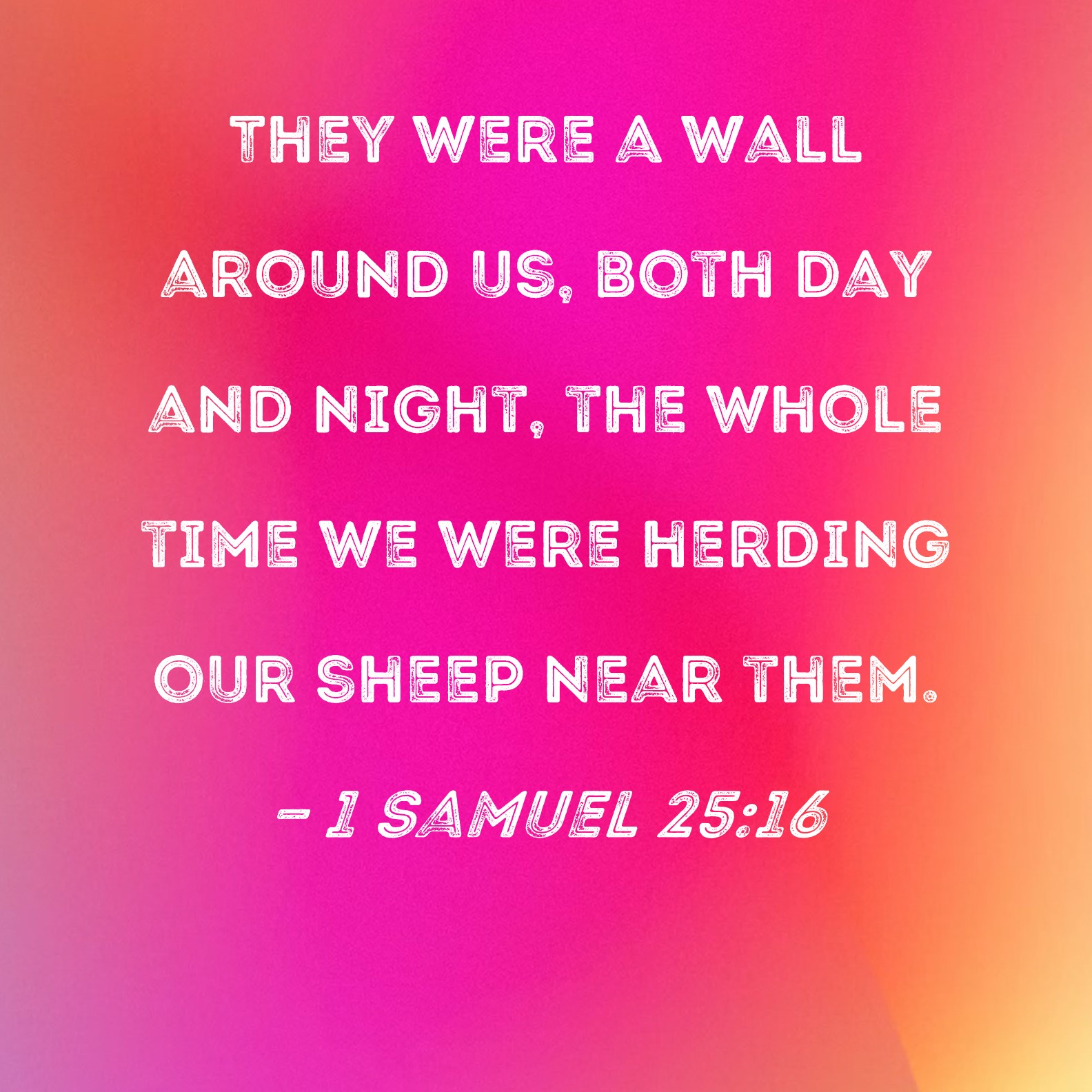 BSB: They were a wall around us, both day and night, the whole time we were herding our sheep near them. KJV: They were a wall unto us both by night and day, all the while we were with them keeping the sheep. DRB: They were a wall unto us both by night and day, all the while we were with them keeping the sheep. DBT: They were a wall to us both by night and day, all the while we were with them feeding the sheep. ERV: they were a wall unto us both by night and by day, all the while we were with them keeping the sheep. WBT: They were a wall to us both by night and day, all the while we were with them keeping the sheep. WEB: They were a wall to us both by night and by day, all the while we were with them keeping the sheep. YLT: a wall they have been unto us both by night and by day, all the days of our being with them, feeding the flock.Links 1 Samuel 25:16 NIV • 1 Samuel 25:16 NLT • 1 Samuel 25:16 ESV • 1 Samuel 25:16 NASB • 1 Samuel 25:16 KJV • 1 Samuel 25:16 Interlinear • 1 Samuel 25:16 Commentaries • 1 Samuel 25:16 Parallel Texts • 1 Samuel 25:16 Bible Apps • 1 Samuel 25:16 Parallel • Bible Hub |