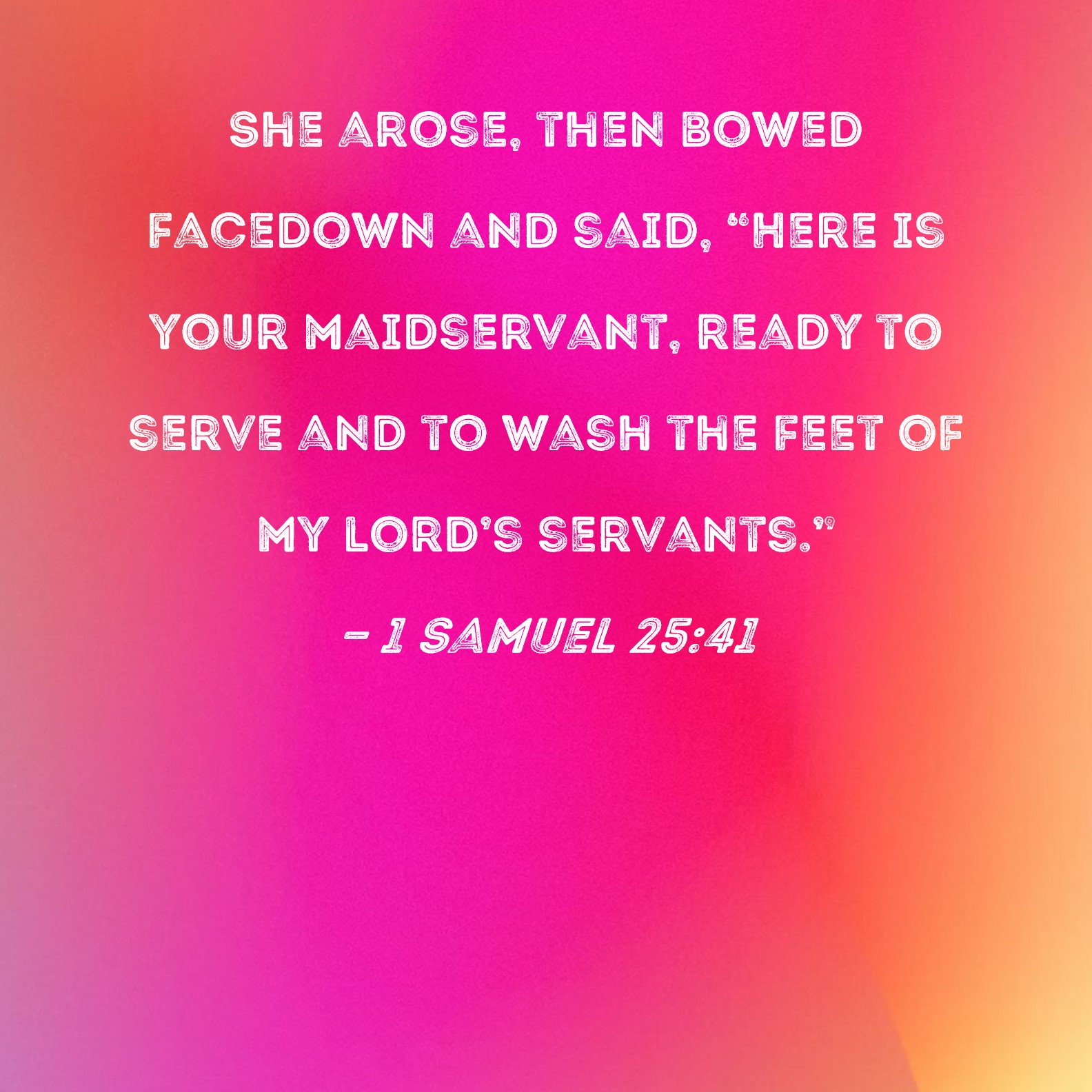 1 Samuel 25:41 She arose, then bowed facedown and said, "Here is your maidservant, ready to serve and to wash the feet of my lord's servants."