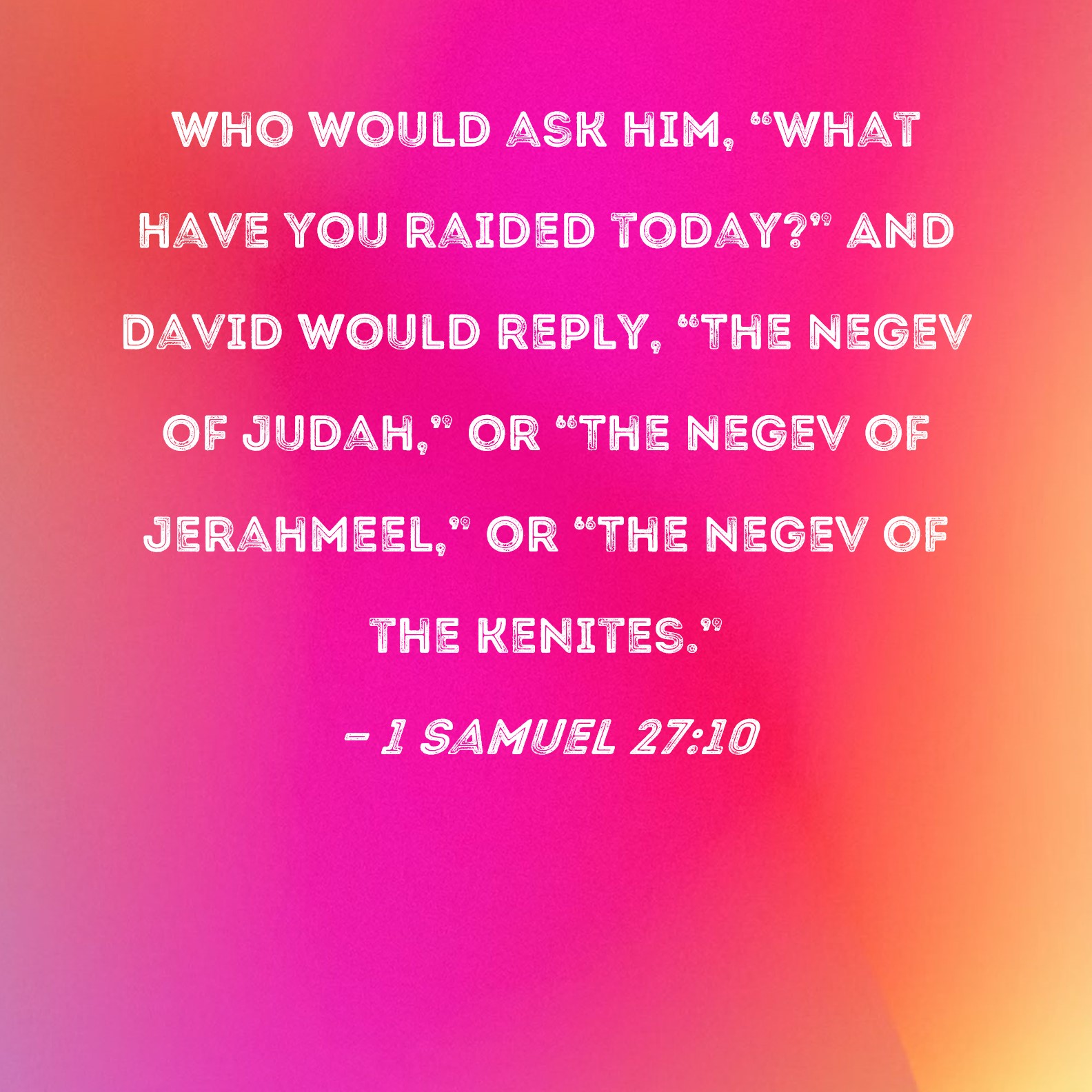 1 Samuel 27:10 who would ask him, "What have you raided today?" And David would reply, "The Negev of Judah," or "The Negev of Jerahmeel," or "The Negev of the Kenites."
