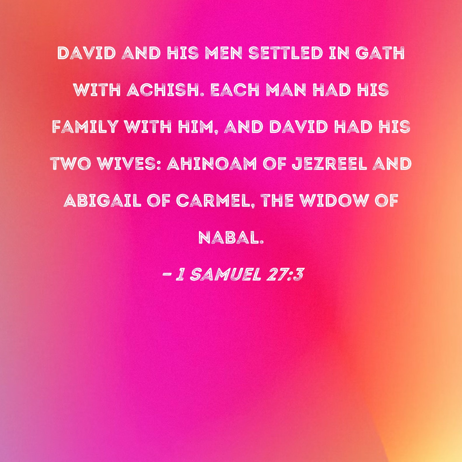 1 Samuel 27:3 David and his men settled in Gath with Achish. Each man had his family with him, and David had his two wives: Ahinoam of Jezreel and Abigail of Carmel, the widow of Nabal.