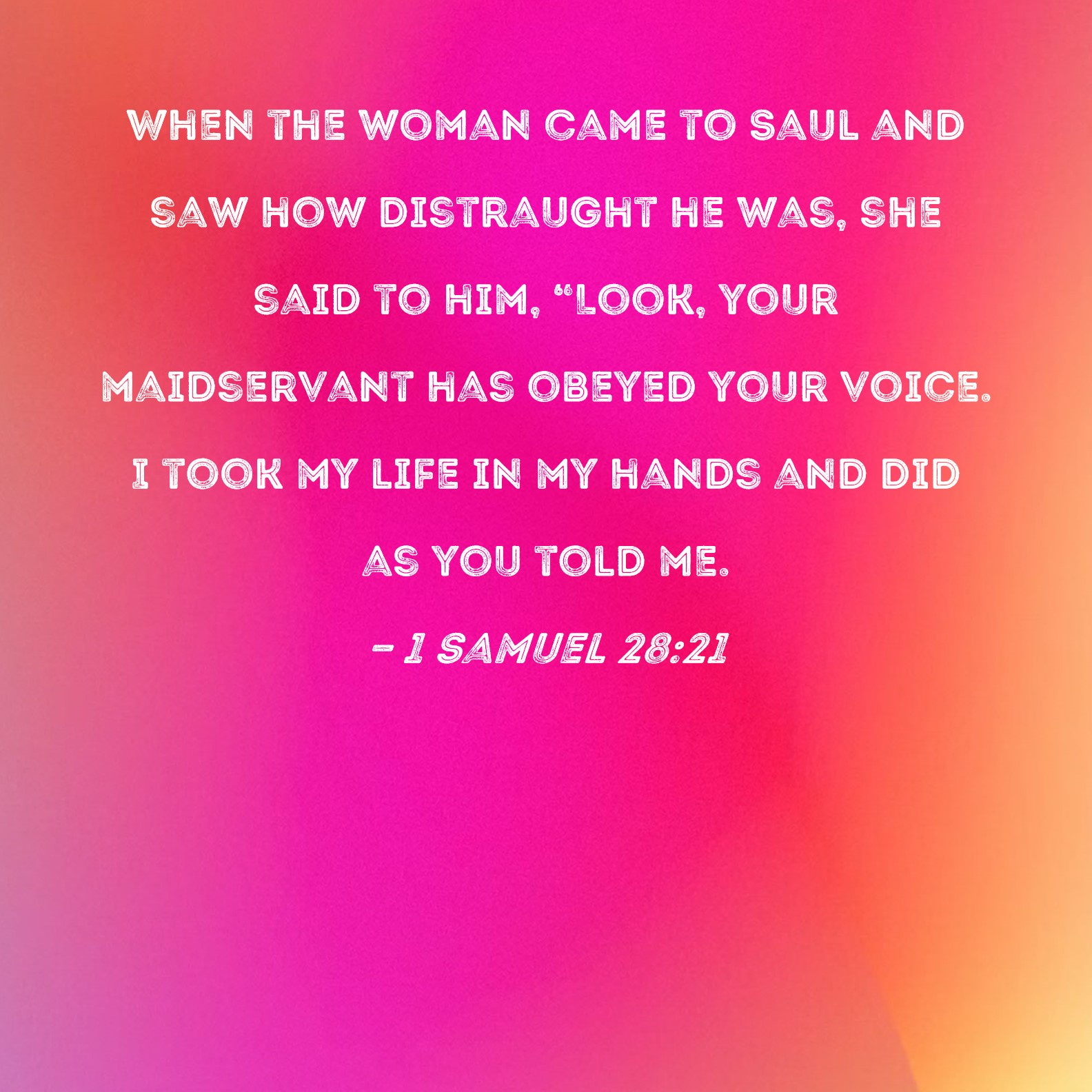 1 Samuel 28:21 When the woman came to Saul and saw how distraught he was, she said to him, "Look, your maidservant has obeyed your voice. I took my life in my hands and did as you told me.