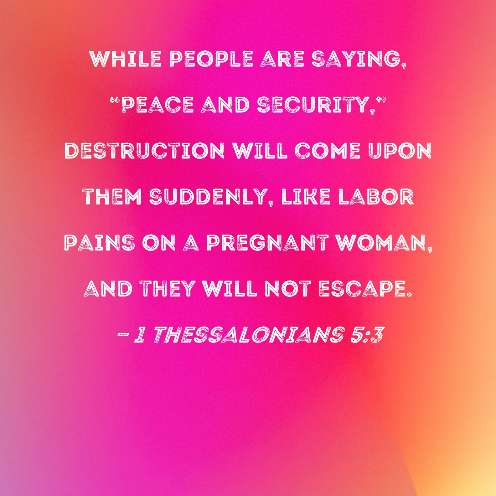 1 Thessalonians 5:3 While people are saying, "Peace and security," destruction will come upon them suddenly, like labor pains on a pregnant woman, and they will not escape.
