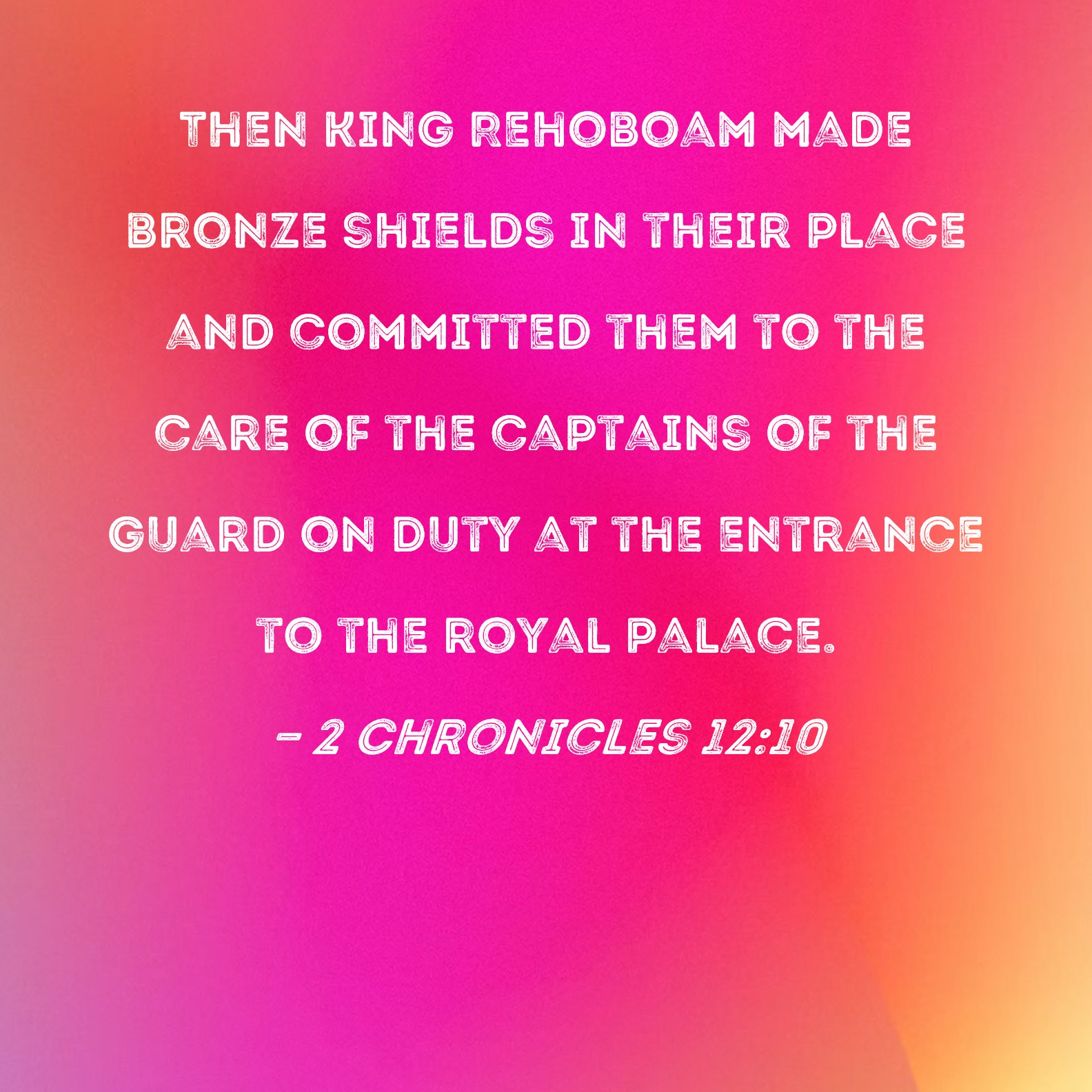 2 Chronicles 12:10 Then King Rehoboam made bronze shields in their place and committed them to the care of the captains of the guard on duty at the entrance to the royal palace.