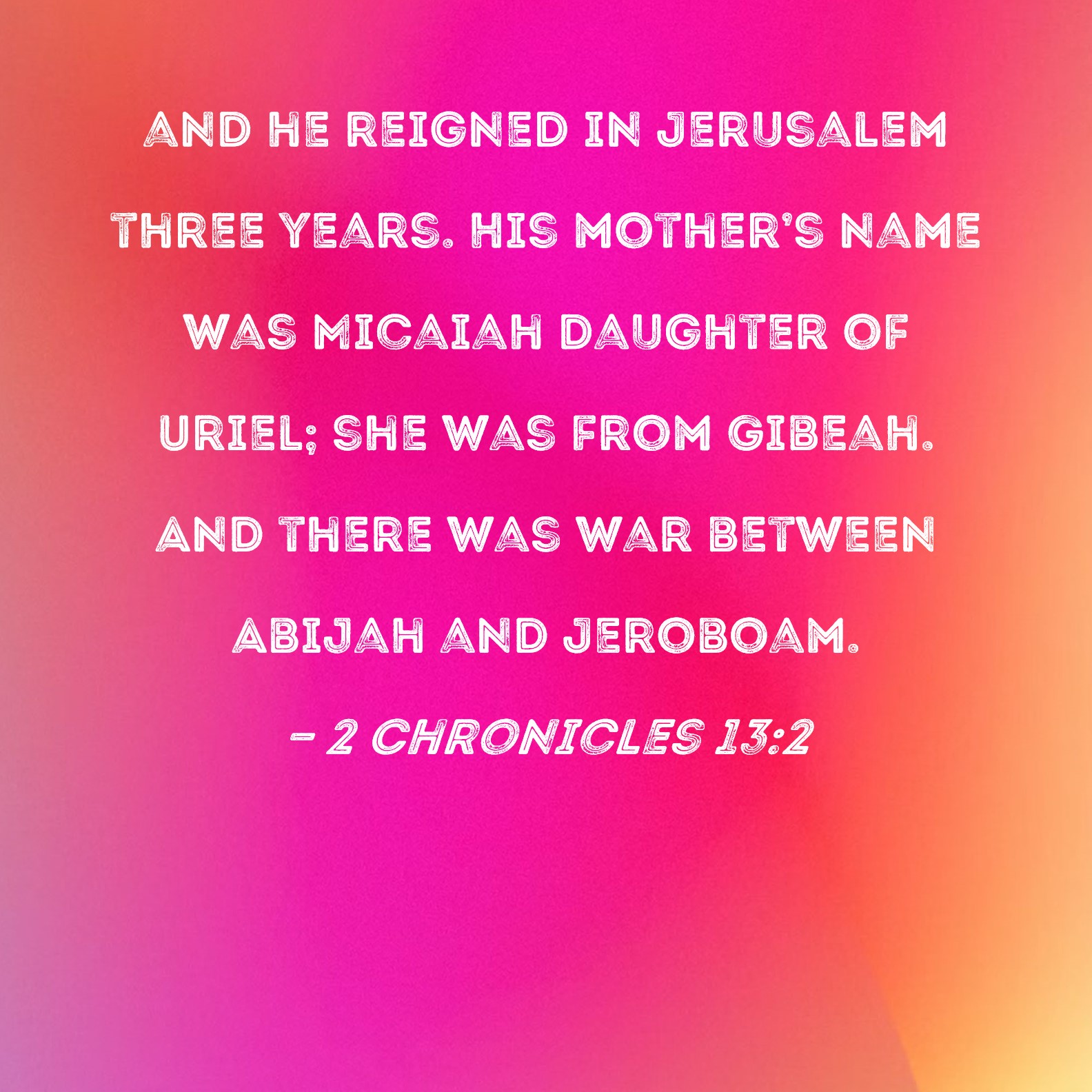 2 Chronicles 13:2 and he reigned in Jerusalem three years. His mother's name was Micaiah daughter of Uriel; she was from Gibeah. And there was war between Abijah and Jeroboam.