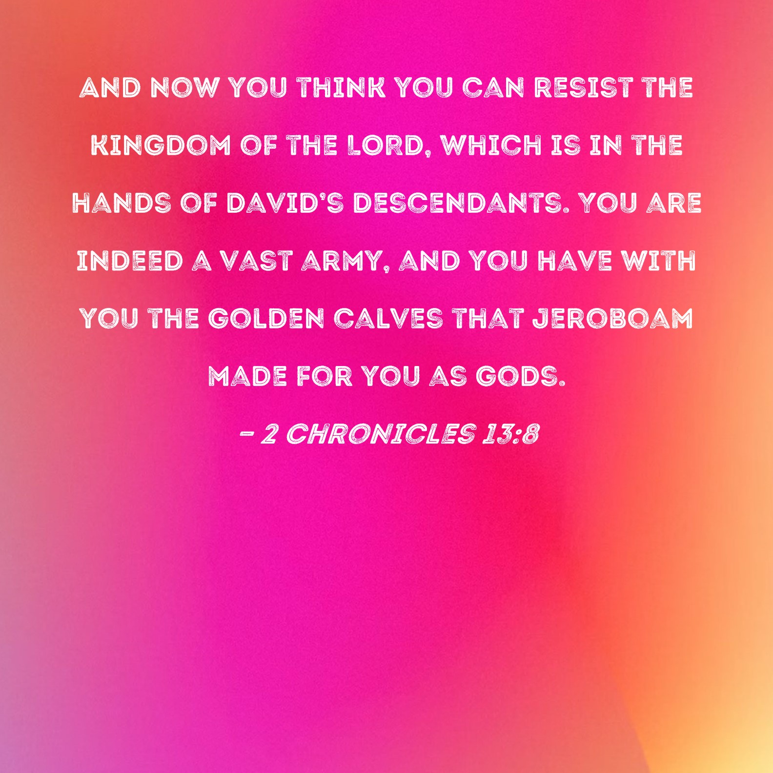 2 Chronicles 13:8 And now you think you can resist the kingdom of the LORD, which is in the hands of David's descendants. You are indeed a vast army, and you have with you the golden calves that Jeroboam made for you as gods.
