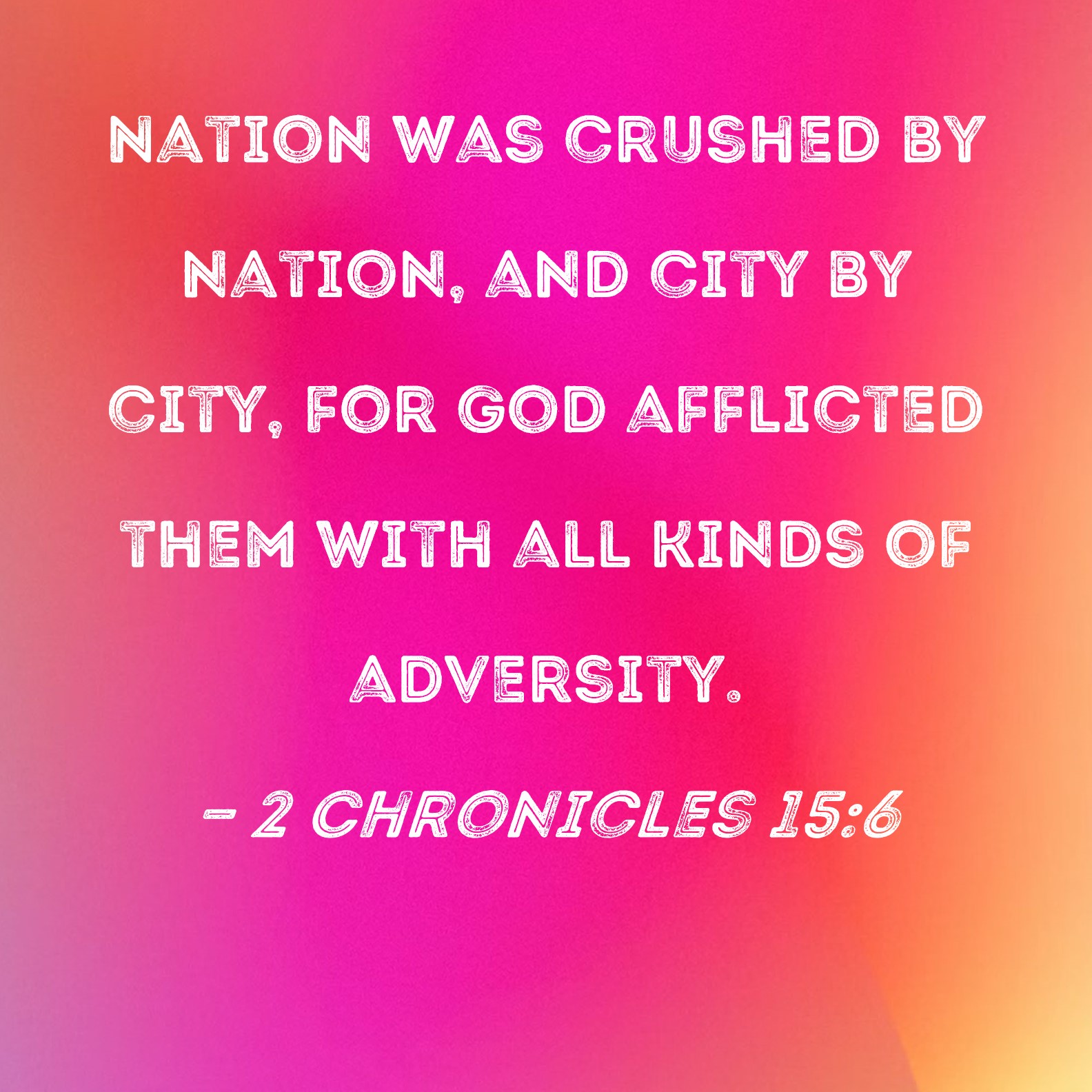 2 Chronicles 15:6 Nation was crushed by nation, and city by city, for God afflicted them with all kinds of adversity.
