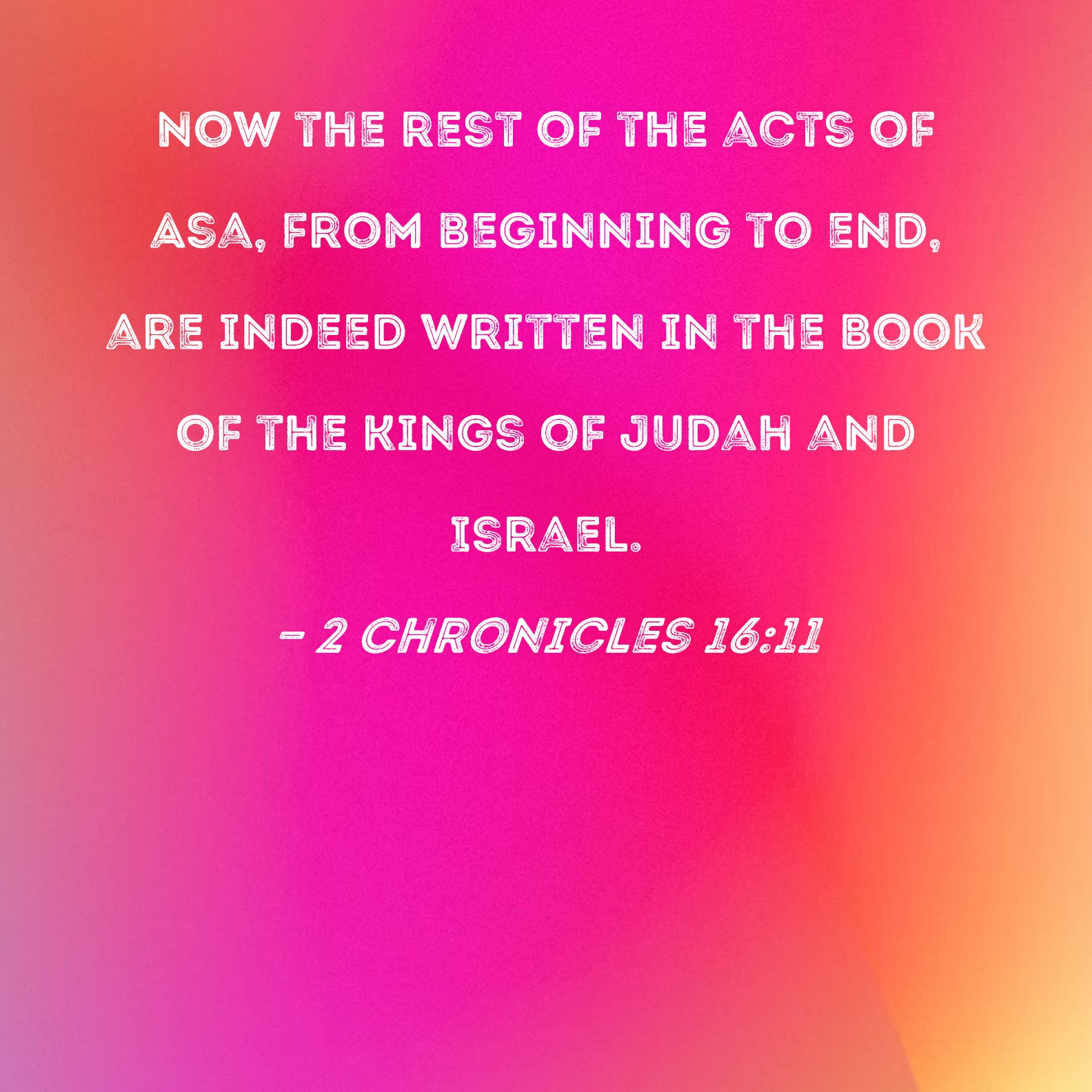 2 Chronicles 16:11 Now the rest of the acts of Asa, from beginning to end, are indeed written in the Book of the Kings of Judah and Israel.
