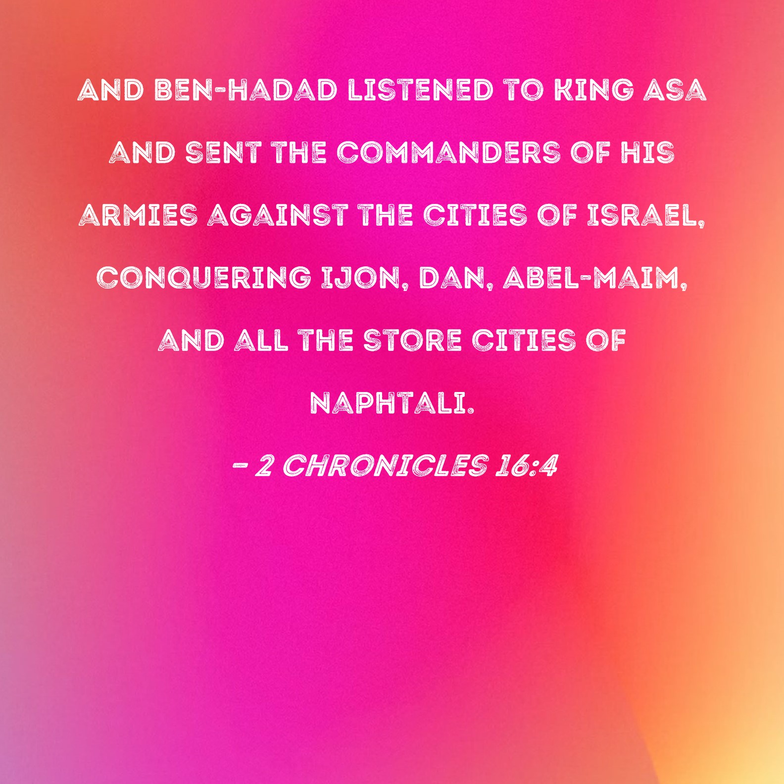 2 Chronicles 16:4 And Ben-hadad listened to King Asa and sent the commanders of his armies against the cities of Israel, conquering Ijon, Dan, Abel-maim, and all the store cities of Naphtali.