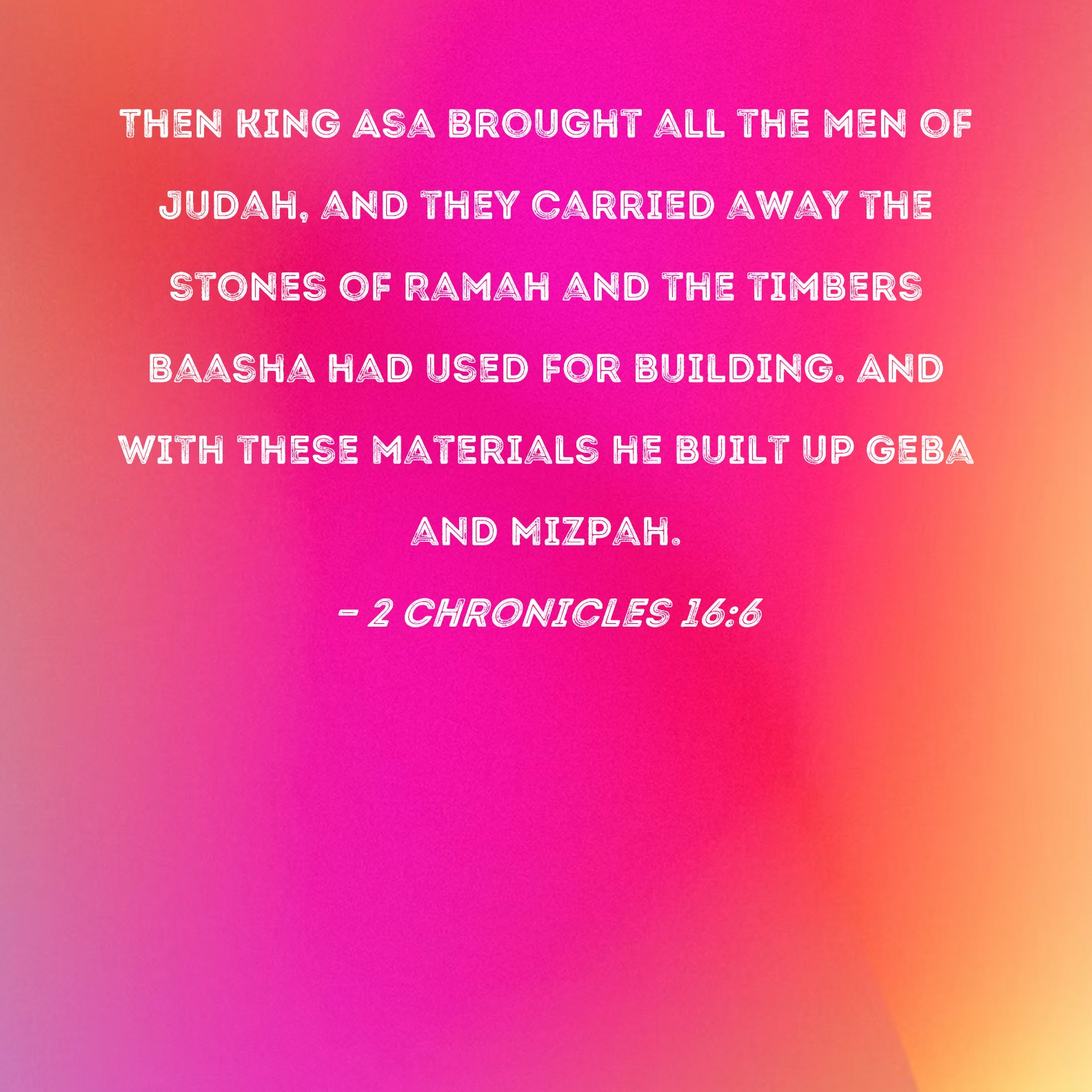 2 Chronicles 16:6 Then King Asa brought all the men of Judah, and they carried away the stones of Ramah and the timbers Baasha had used for building. And with these materials he built up Geba and Mizpah.