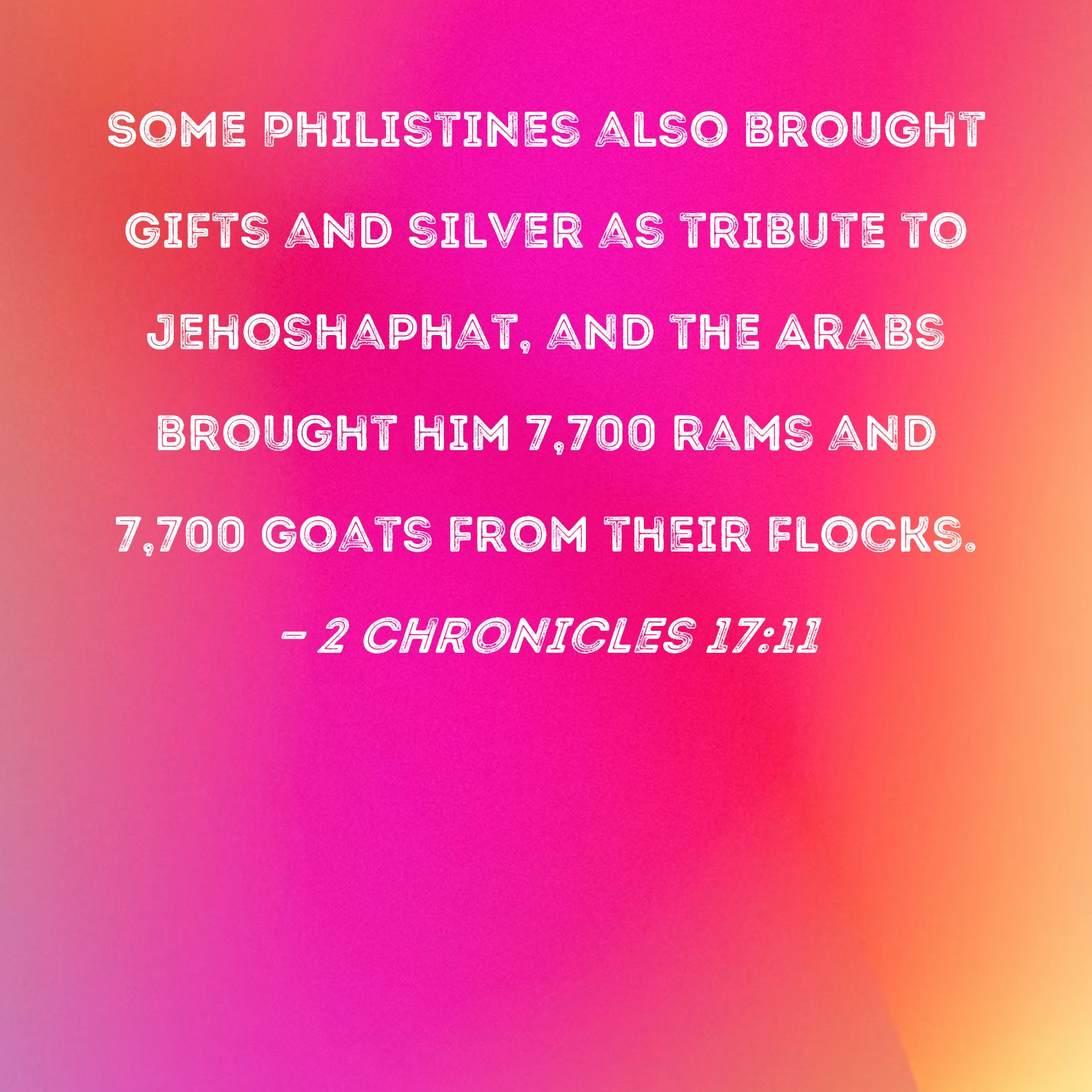 2 Chronicles 17:11 Some Philistines also brought gifts and silver as tribute to Jehoshaphat, and the Arabs brought him 7,700 rams and 7,700 goats from their flocks.
