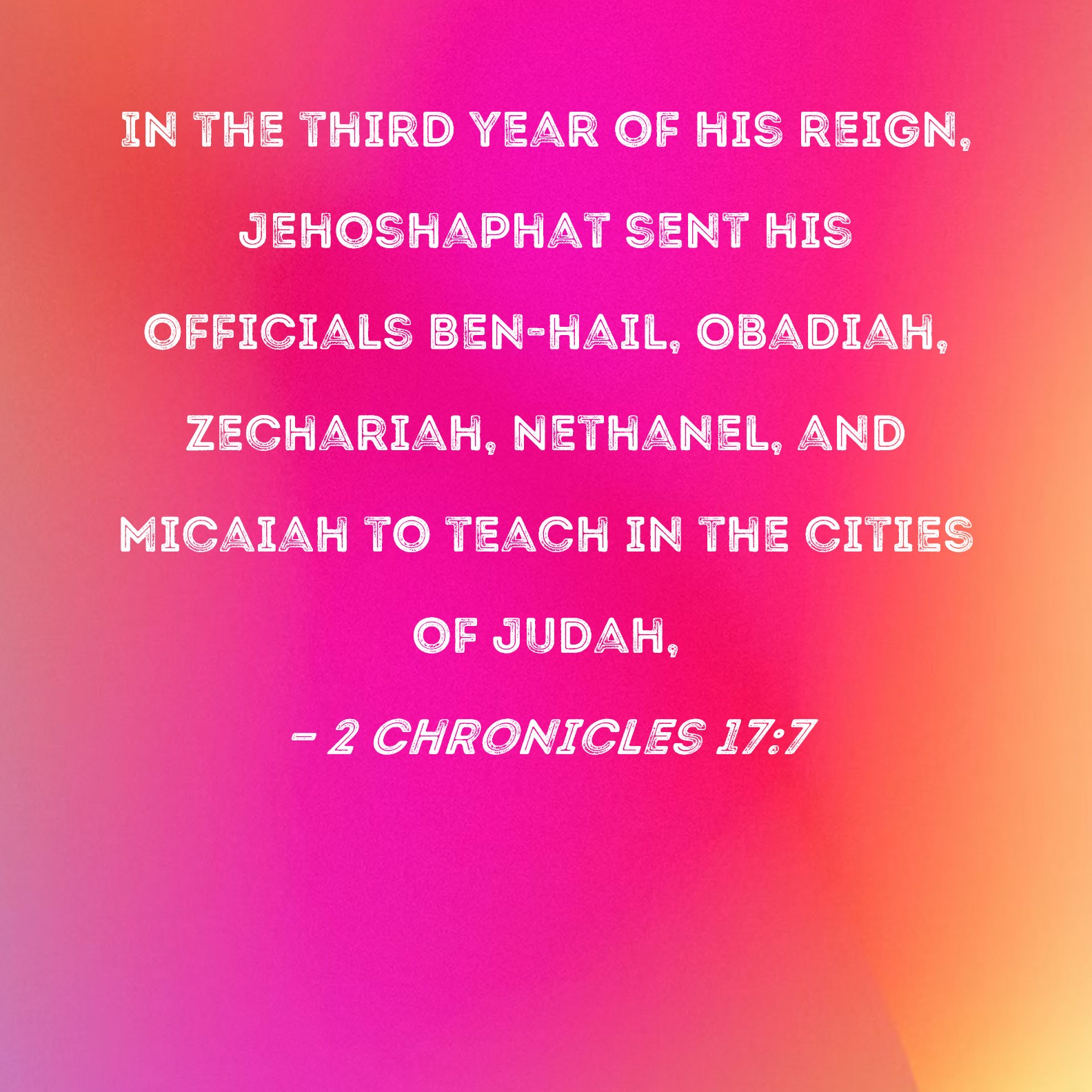 2 Chronicles 17:7 In the third year of his reign, Jehoshaphat sent his officials Ben-hail, Obadiah, Zechariah, Nethanel, and Micaiah to teach in the cities of Judah,