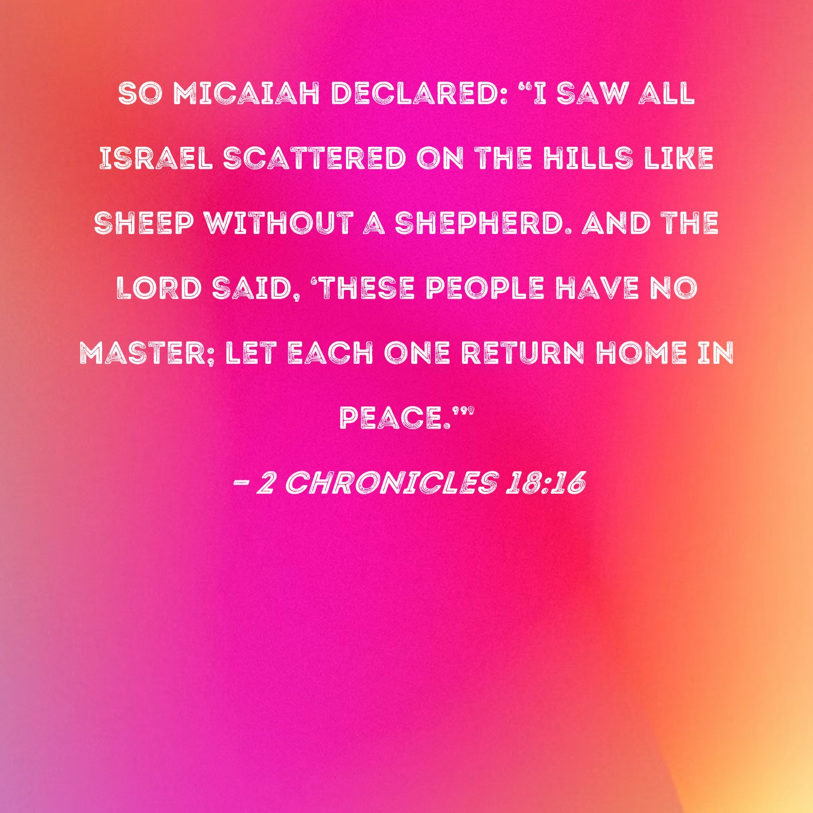 2 Chronicles 18:16 So Micaiah declared: "I saw all Israel scattered on the hills like sheep without a shepherd. And the LORD said, 'These people have no master; let each one return home in peace.'"