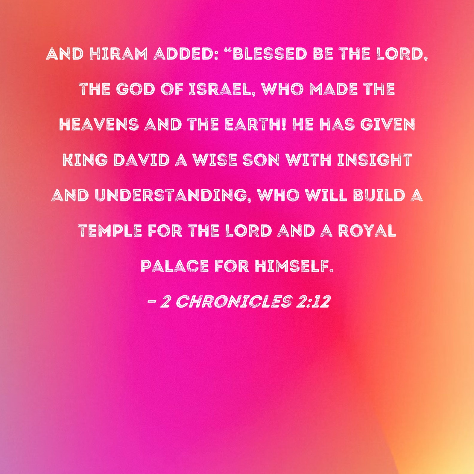 2 Chronicles 2:12 And Hiram added: "Blessed be the LORD, the God of Israel, who made the heavens and the earth! He has given King David a wise son with insight and understanding, who will build a temple for the LORD and a royal palace for himself.