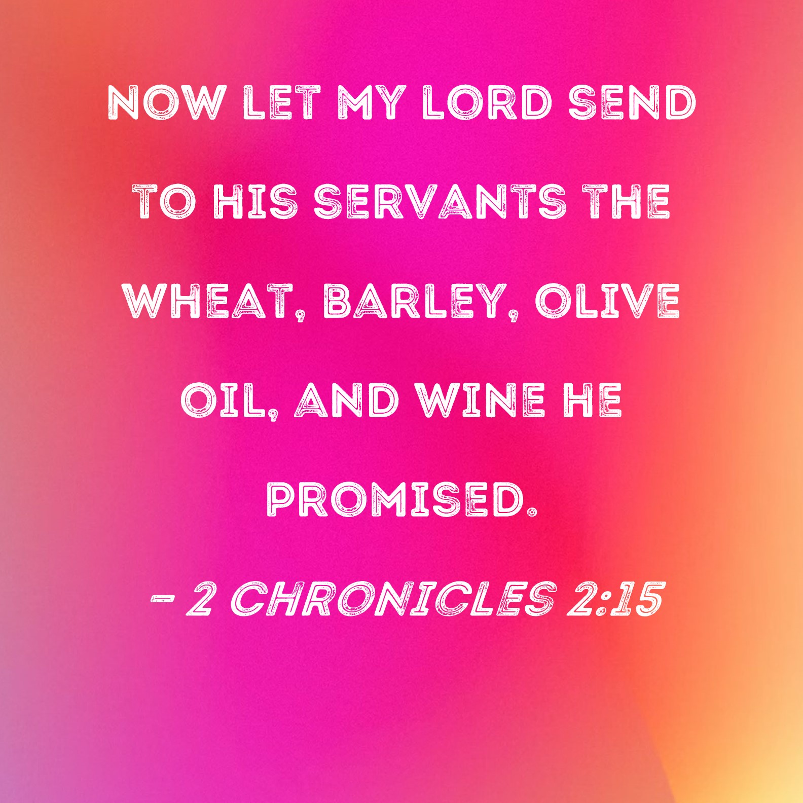 2 Chronicles 2:15 Now let my lord send to his servants the wheat, barley, olive oil, and wine he promised.