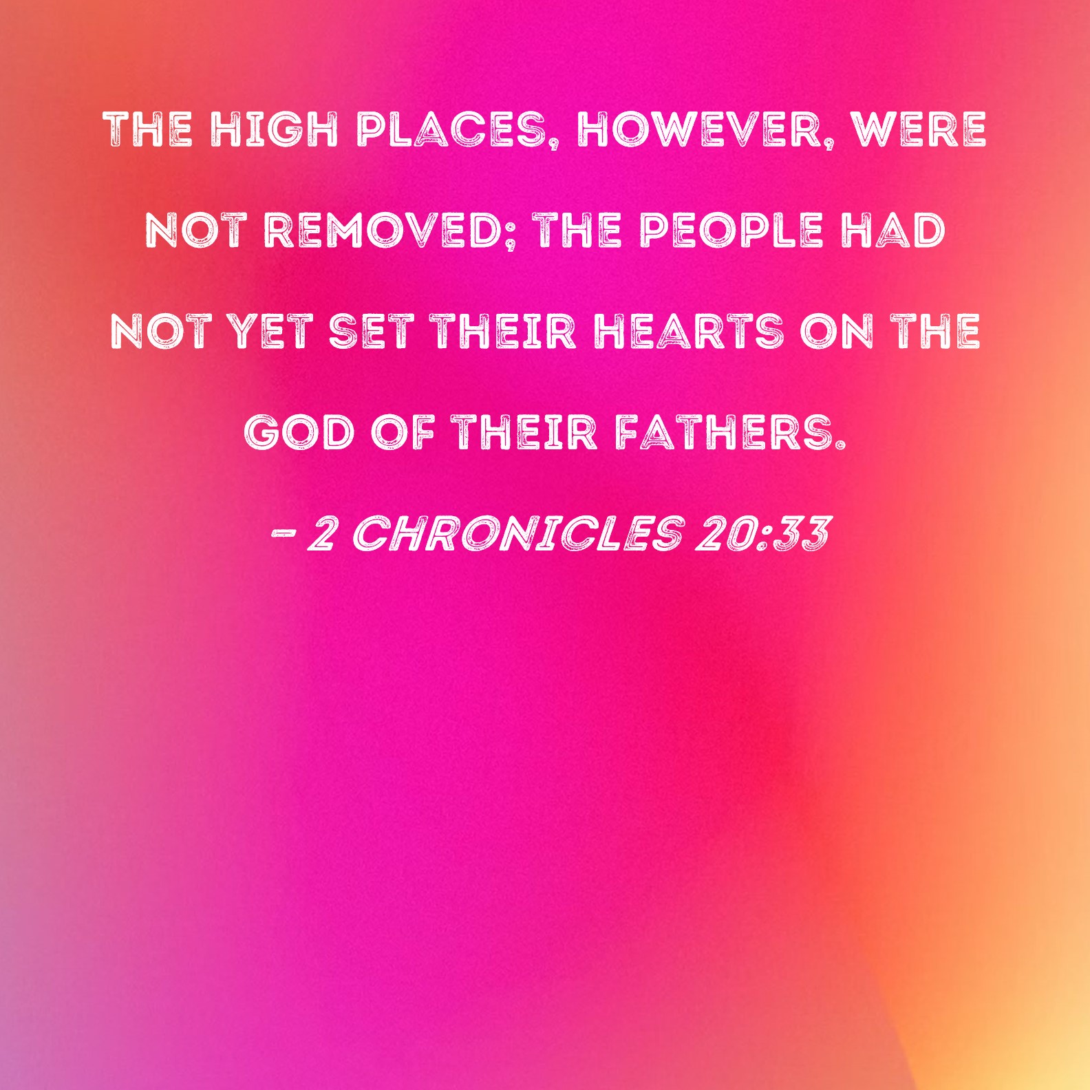 2 Chronicles 20:33 The high places, however, were not removed; the people had not yet set their hearts on the God of their fathers.
