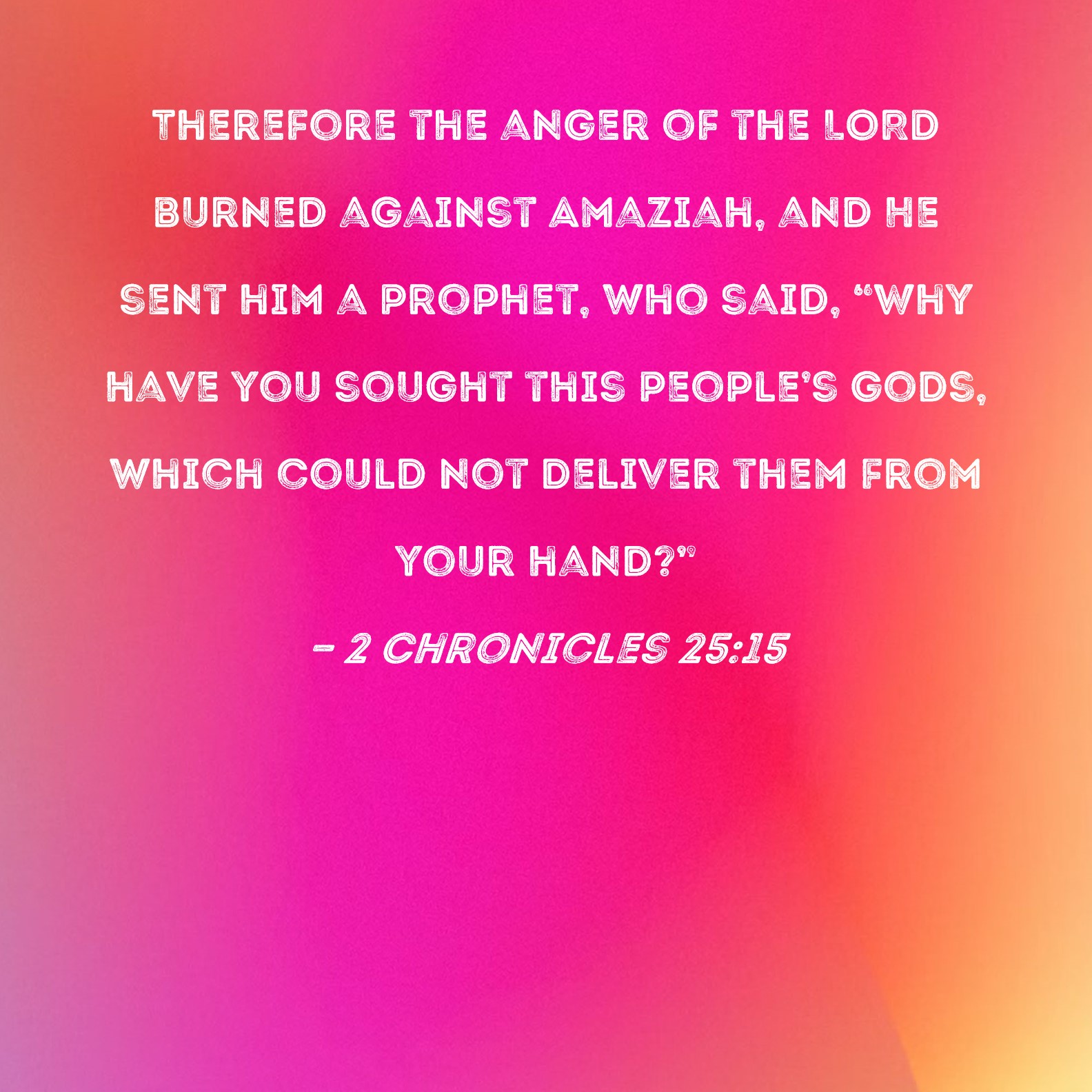 2 Chronicles 25:15 Therefore the anger of the LORD burned against Amaziah, and He sent him a prophet, who said, "Why have you sought this people's gods, which could not deliver them from your hand?"