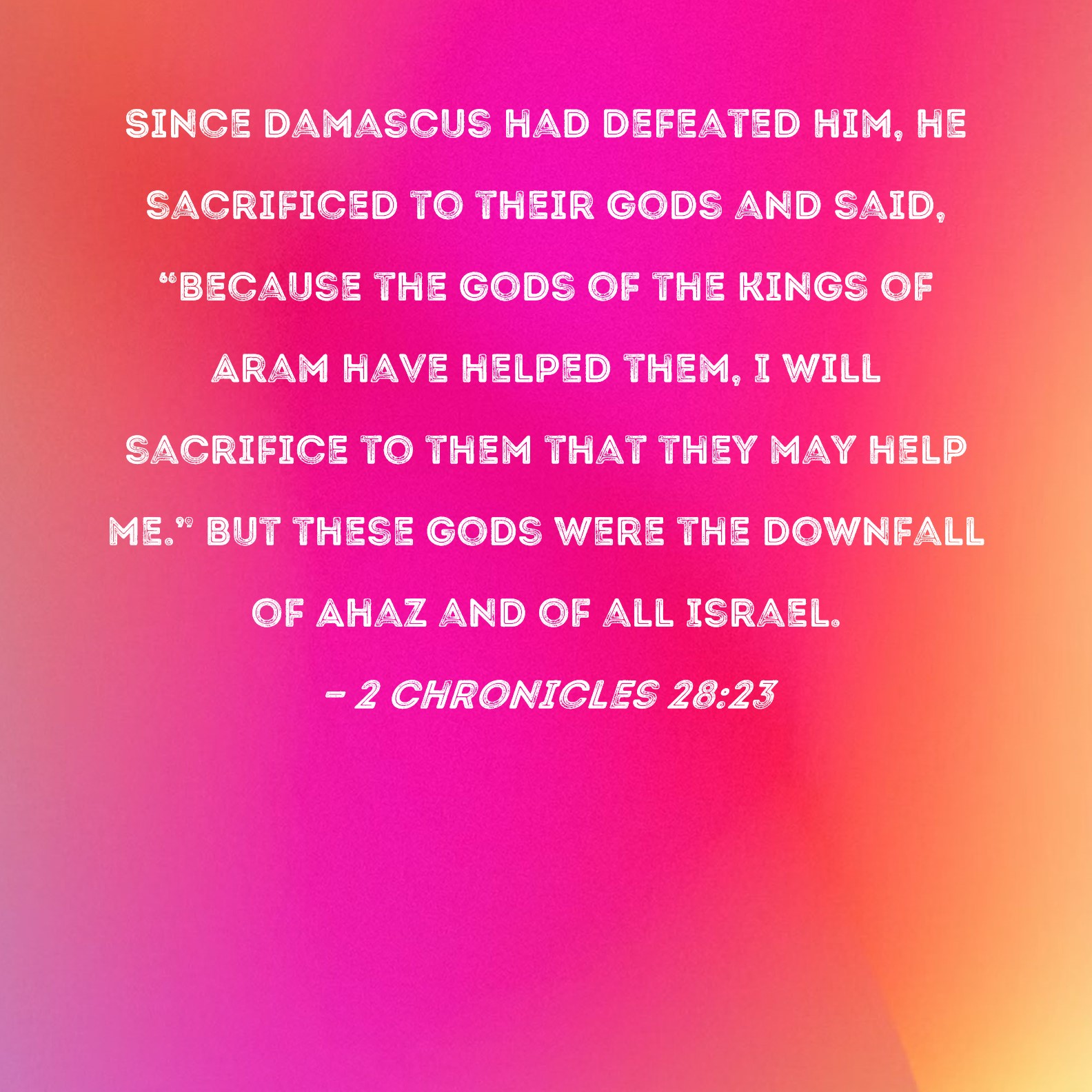 2 Chronicles 28:23 Since Damascus had defeated him, he sacrificed to their gods and said, "Because the gods of the kings of Aram have helped them, I will sacrifice to them that they may help me." But these gods were the downfall of Ahaz and of all Israel.