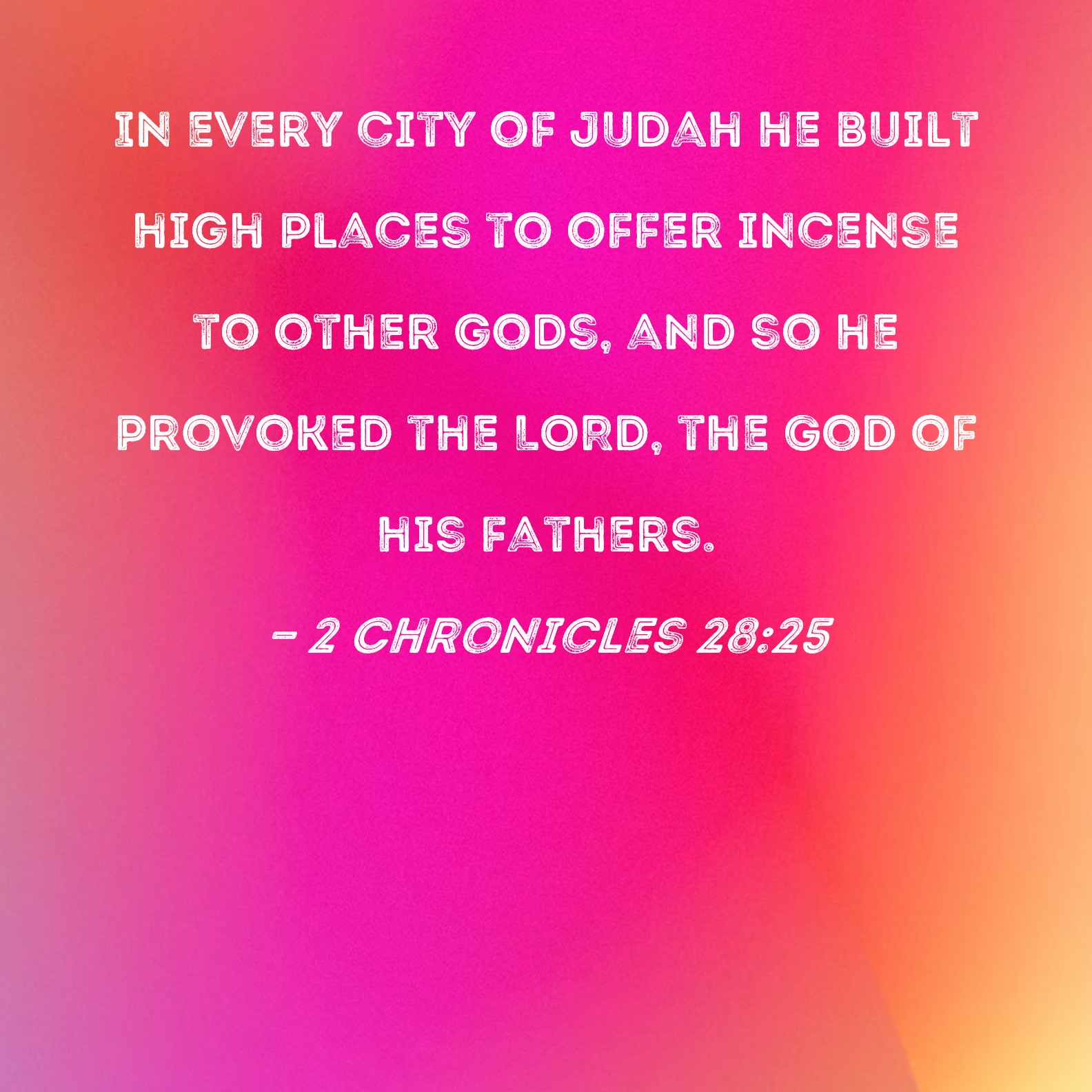 2 Chronicles 28:25 In every city of Judah he built high places to offer incense to other gods, and so he provoked the LORD, the God of his fathers.