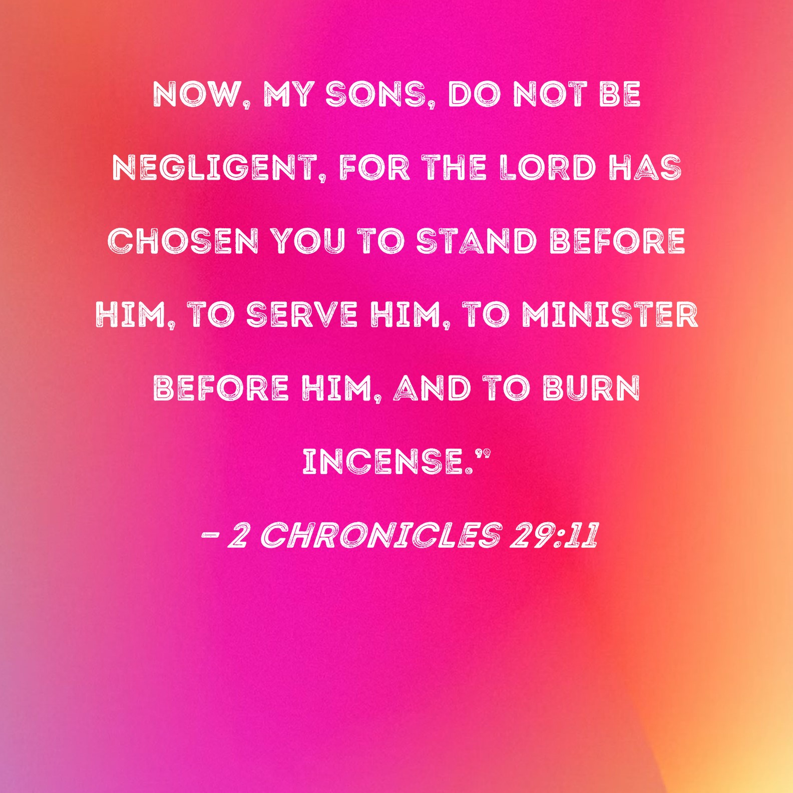 2 Chronicles 29:11 Now, my sons, do not be negligent, for the LORD has chosen you to stand before Him, to serve Him, to minister before Him, and to burn incense."