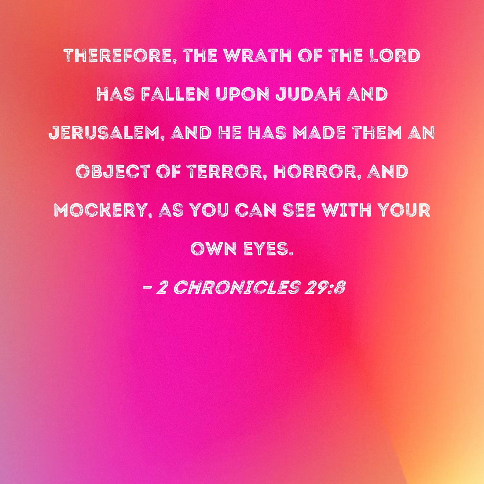 2 Chronicles 29:8 Therefore, the wrath of the LORD has fallen upon Judah and Jerusalem, and He has made them an object of terror, horror, and mockery, as you can see with your own eyes.