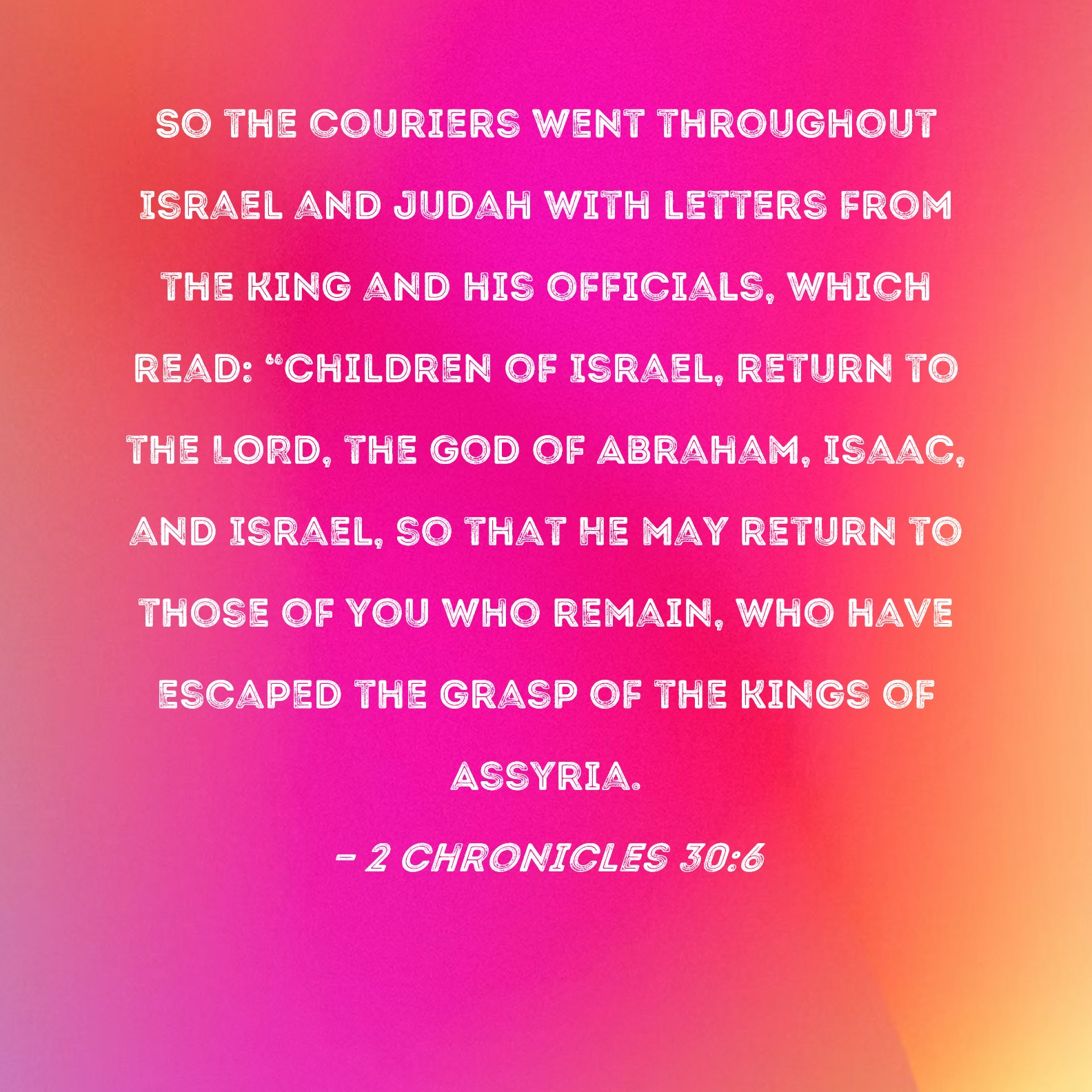 2 Chronicles 30:6 So the couriers went throughout Israel and Judah with letters from the king and his officials, which read: "Children of Israel, return to the LORD, the God of Abraham, Isaac, and Israel, so that He may return to those of you who remain, who have escaped the grasp of the kings of Assyria.