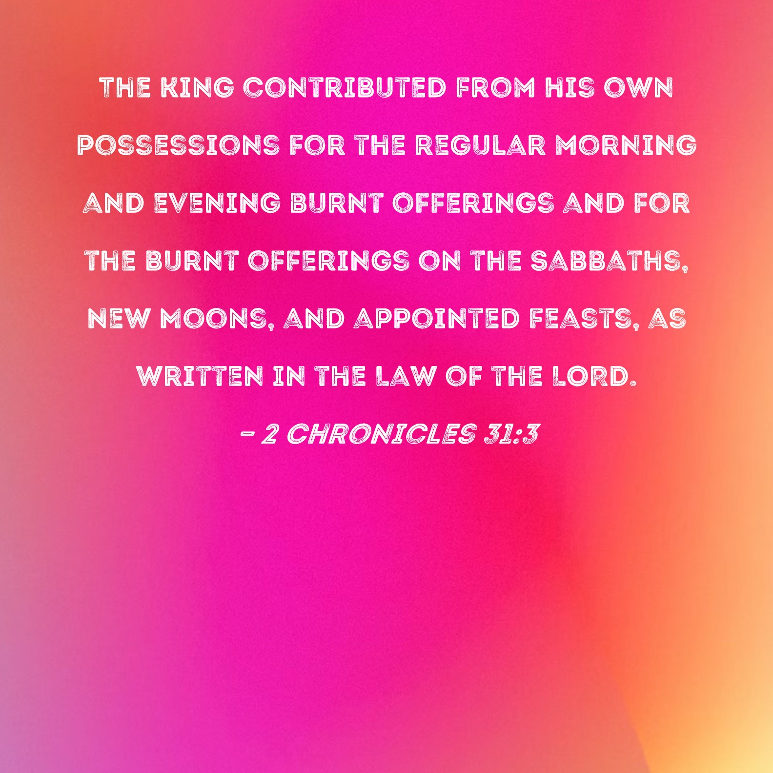 2 Chronicles 31:3 The king contributed from his own possessions for the regular morning and evening burnt offerings and for the burnt offerings on the Sabbaths, New Moons, and appointed feasts, as written in the Law of the LORD.