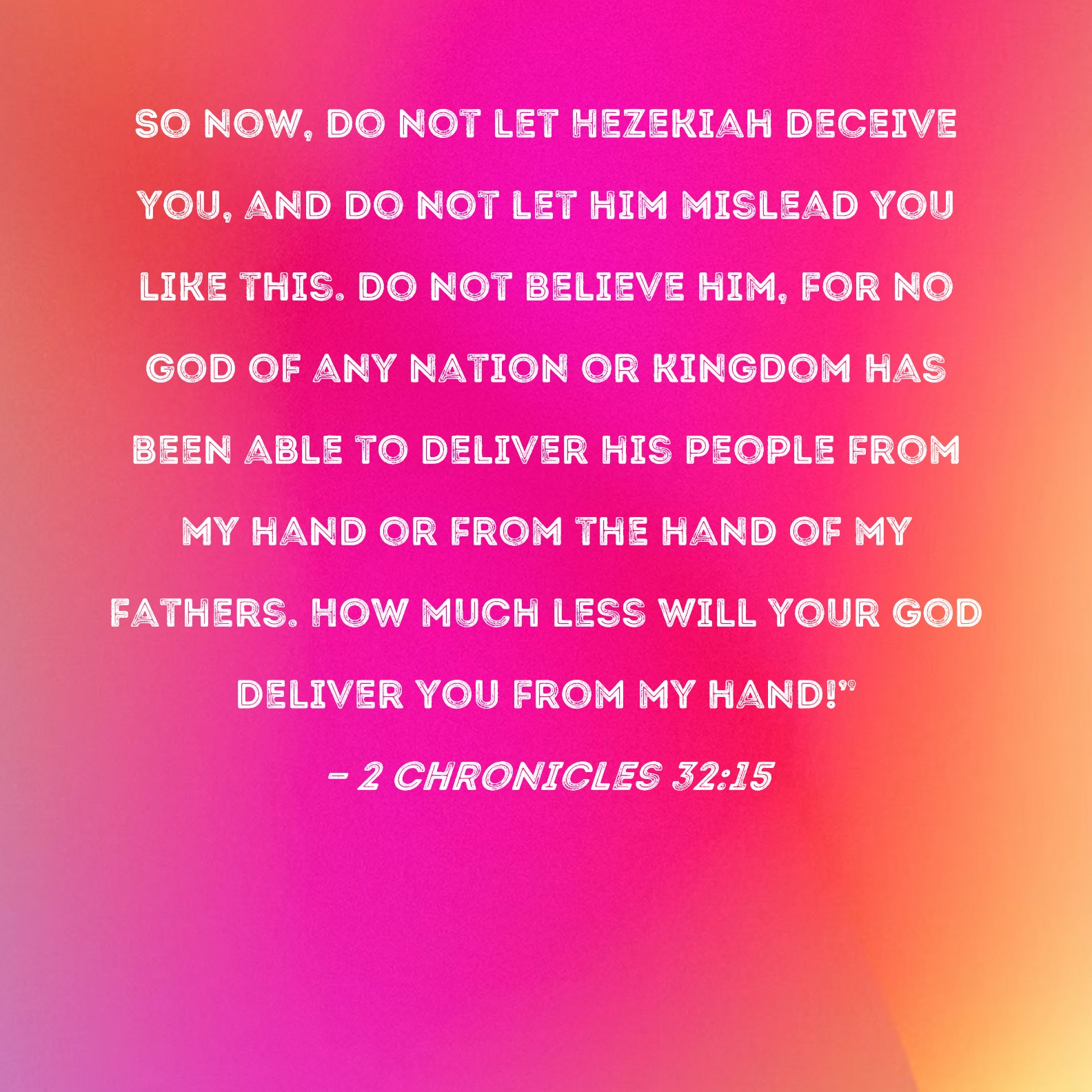 So now, do not let Hezekiah deceive you, and do not let him mislead you like this. Do not believe him, for no god of any nation or kingdom has been able to deliver his people from my hand or from the hand of my fathers. How much less will your God deliver you from my hand!"