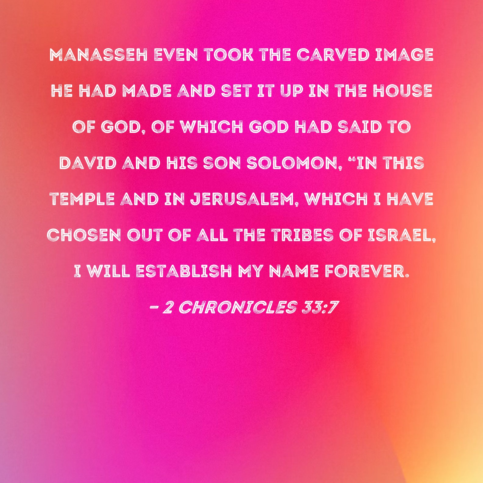 2 Chronicles 33:7 Manasseh even took the carved image he had made and set it up in the house of God, of which God had said to David and his son Solomon, "In this temple and in Jerusalem, which I have chosen out of all the tribes of Israel, I will establish My Name forever.