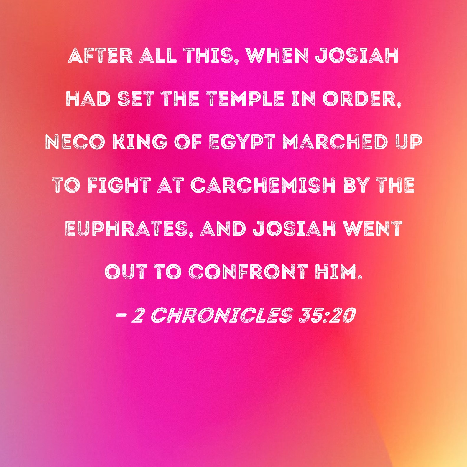 2 Chronicles 35:20 After all this, when Josiah had set the temple in order, Neco king of Egypt marched up to fight at Carchemish by the Euphrates, and Josiah went out to confront him.