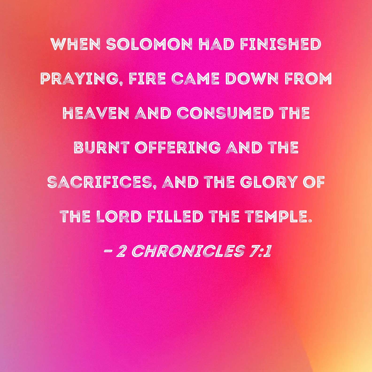 2 Chronicles 7:1 When Solomon had finished praying, fire came down from heaven and consumed the burnt offering and the sacrifices, and the glory of the LORD filled the temple.