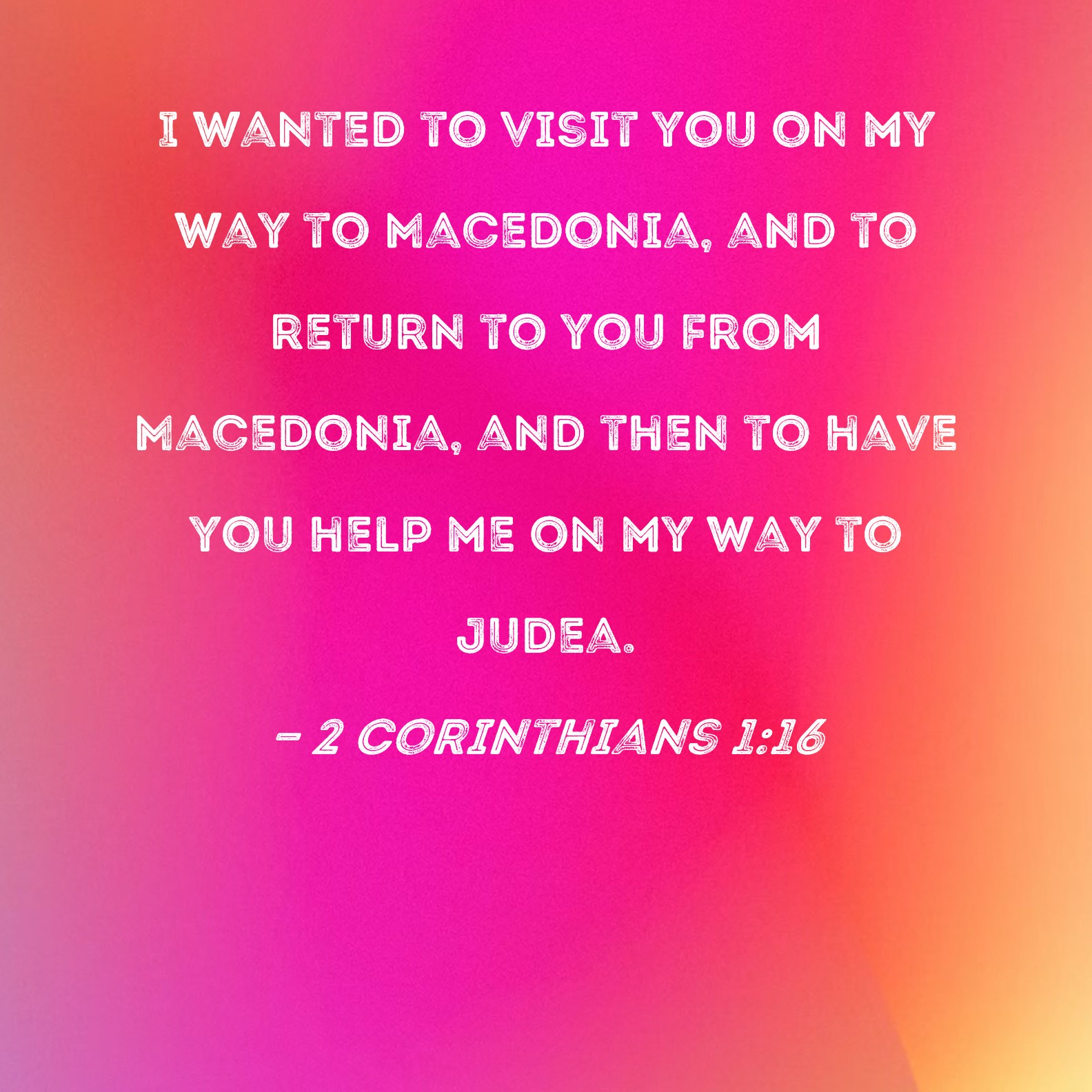 2 Corinthians 1:16 I wanted to visit you on my way to Macedonia, and to return to you from Macedonia, and then to have you help me on my way to Judea.