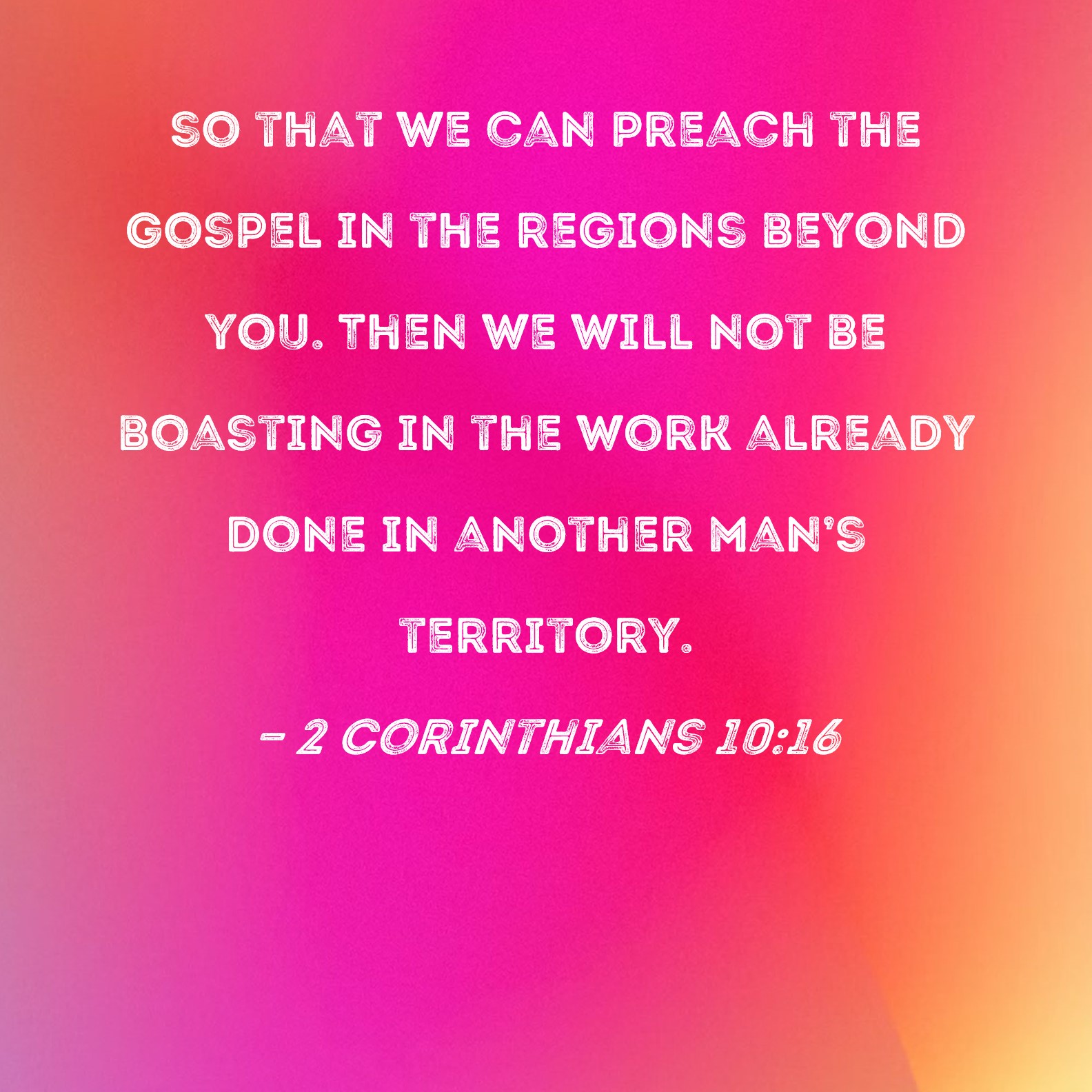 2 Corinthians 10:16 so that we can preach the gospel in the regions beyond you. Then we will not be boasting in the work already done in another man's territory.