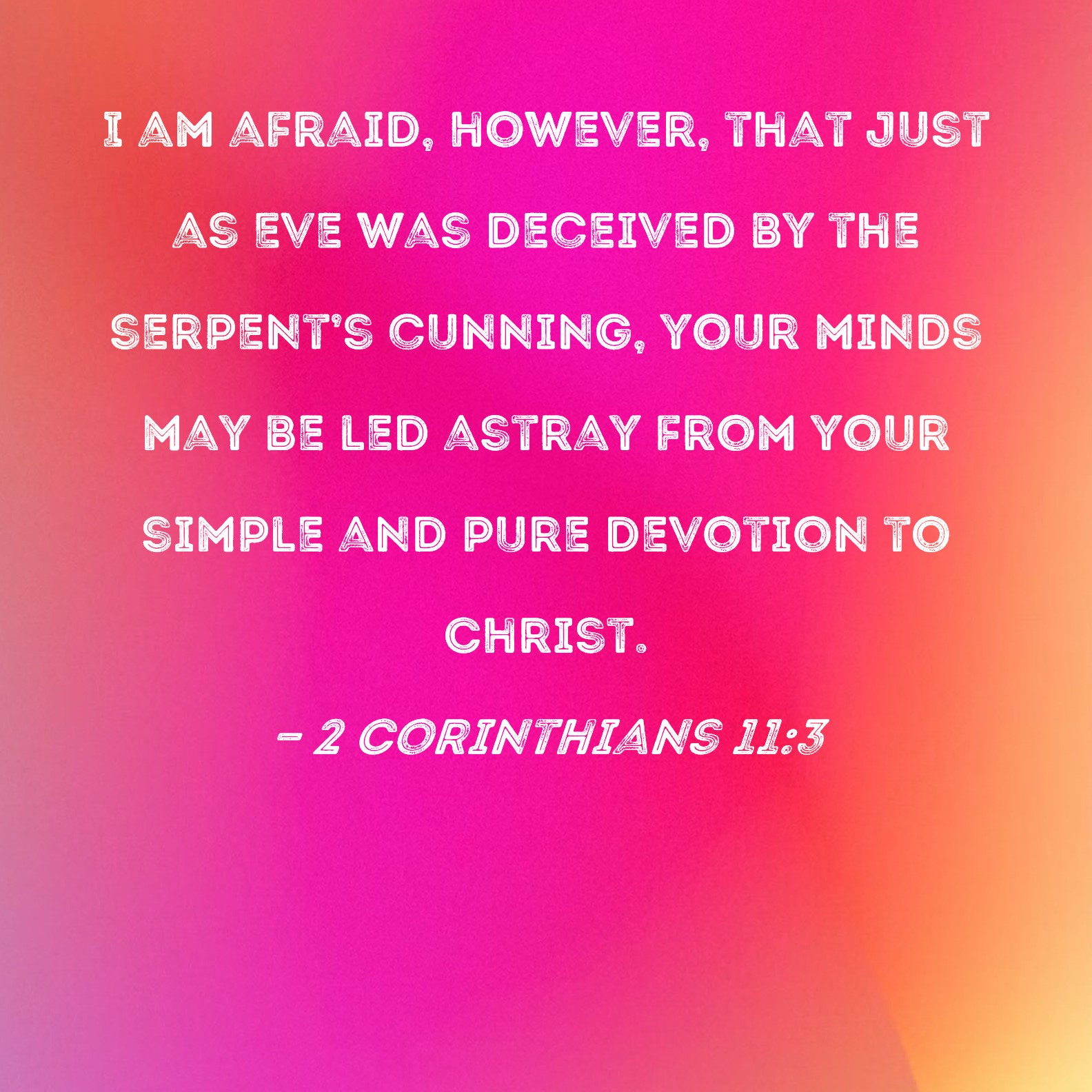 2 Corinthians 11:3 I am afraid, however, that just as Eve was deceived by the serpent's cunning, your minds may be led astray from your simple and pure devotion to Christ.