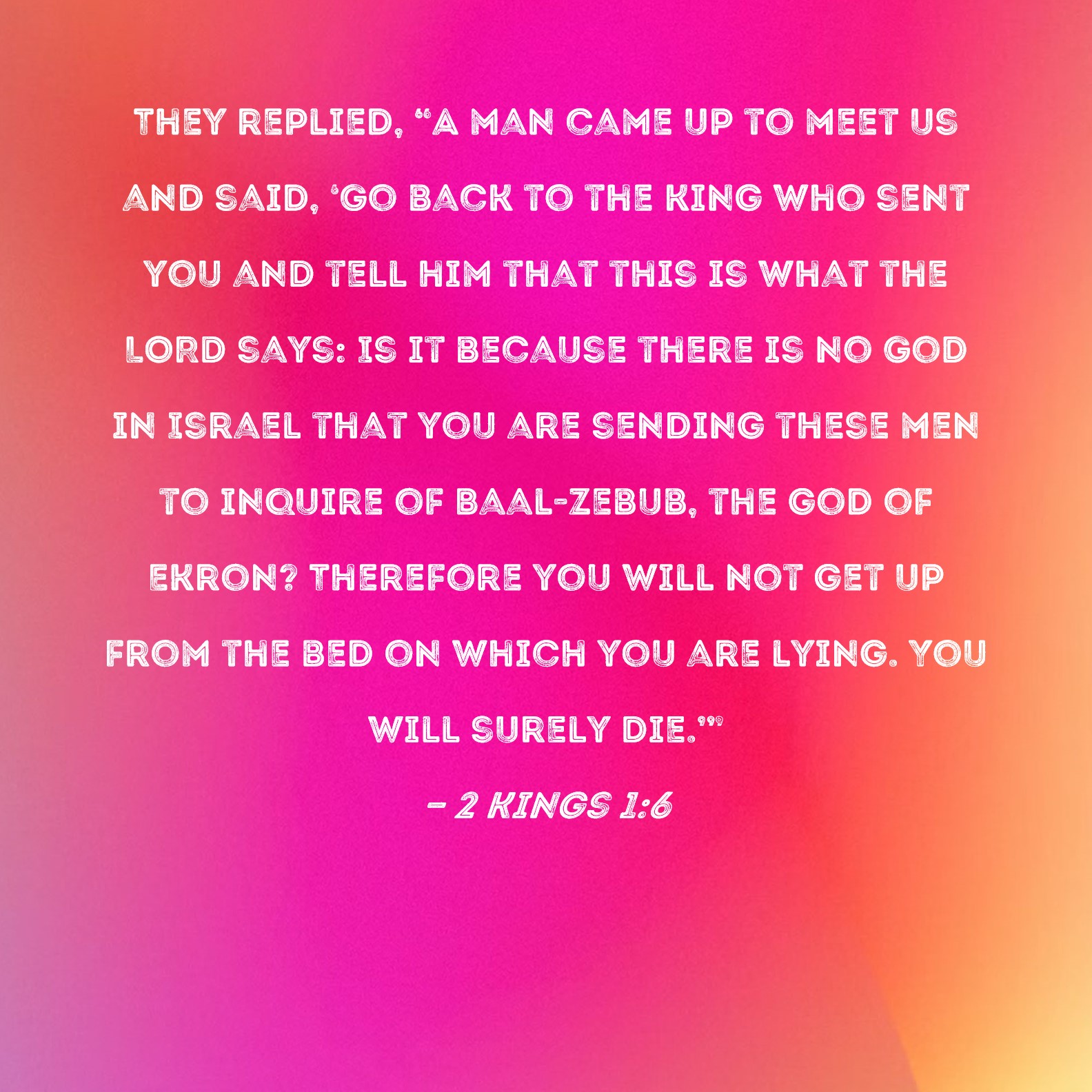 2 Kings 1:6 They replied, "A man came up to meet us and said, 'Go back to the king who sent you and tell him that this is what the LORD says: Is it because there is no God in Israel that you are sending these men to inquire of Baal-zebub, the god of Ekron? Therefore you will not get up from the bed on which you are lying. You will surely die.'"