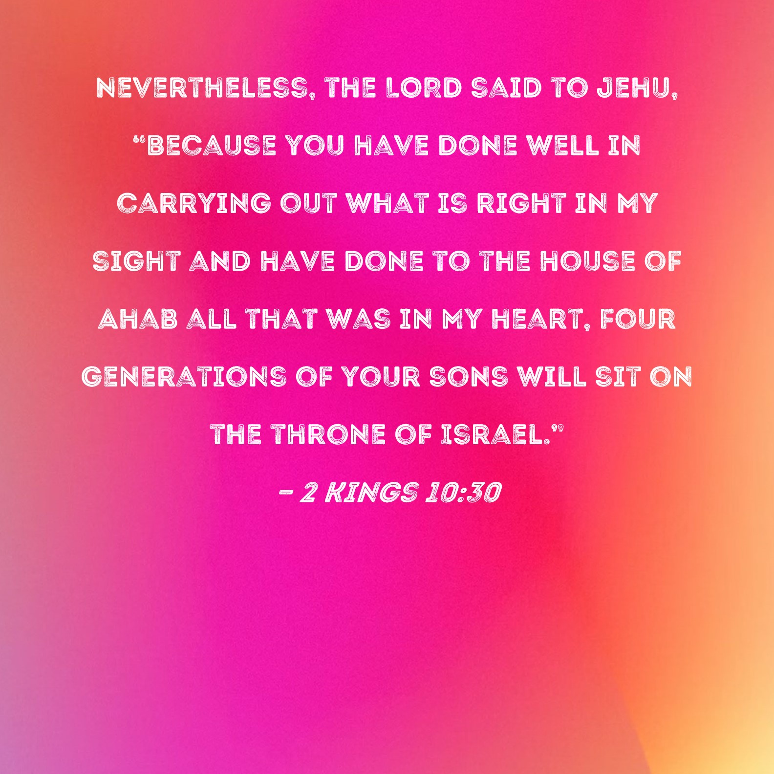 2 Kings 10:30 Nevertheless, the LORD said to Jehu, "Because you have done well in carrying out what is right in My sight and have done to the house of Ahab all that was in My heart, four generations of your sons will sit on the throne of Israel."