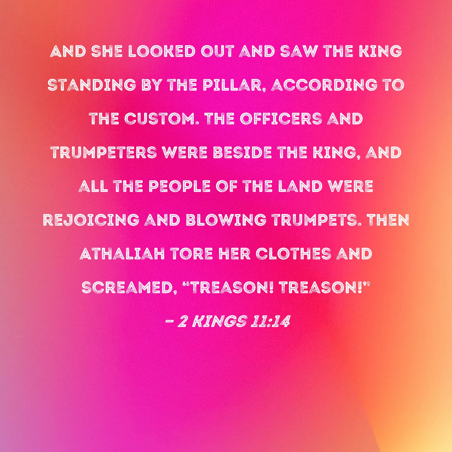 2 Kings 11:14 And she looked out and saw the king standing by the pillar, according to the custom. The officers and trumpeters were beside the king, and all the people of the land were rejoicing and blowing trumpets. Then Athaliah tore her clothes and screamed, "Treason! Treason!"