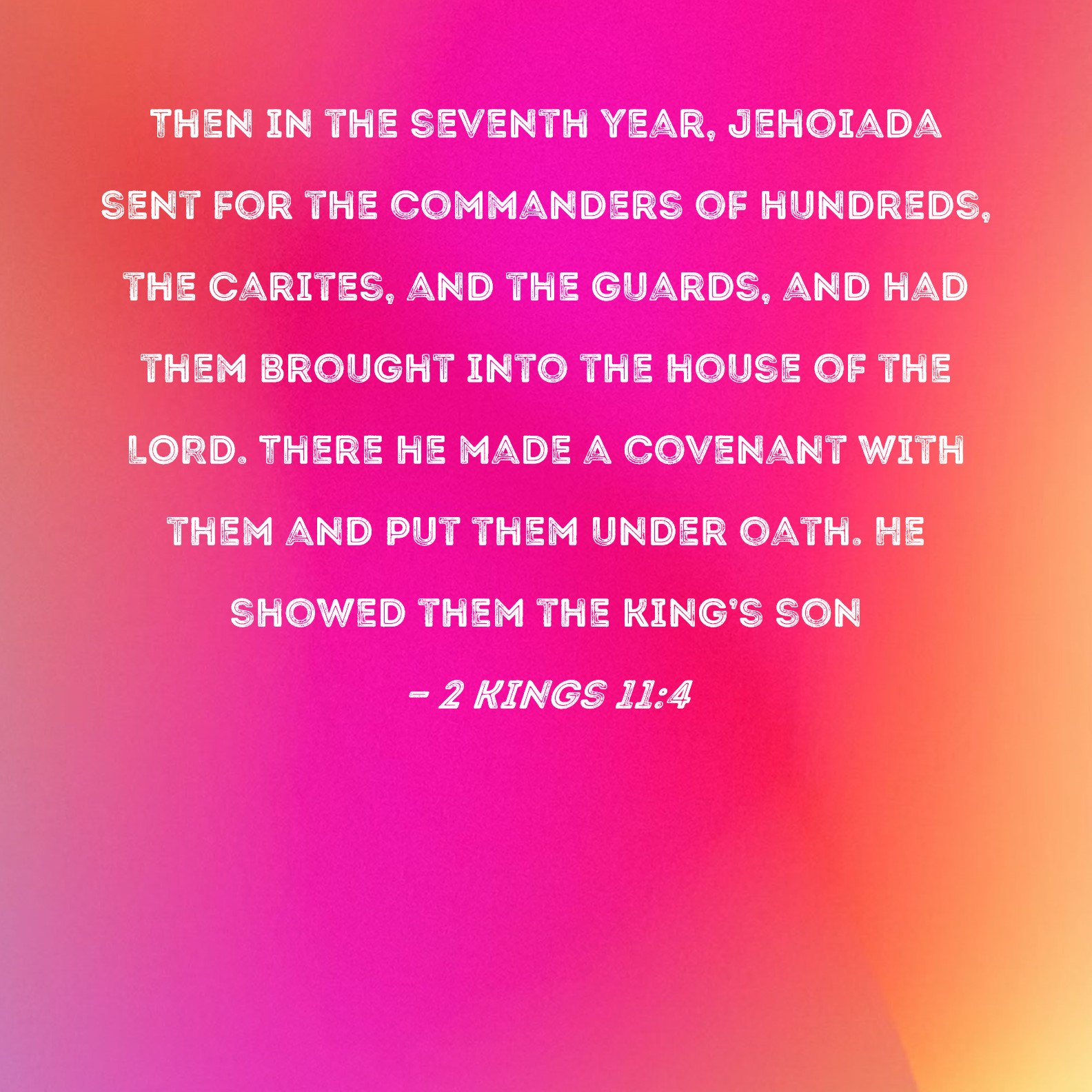 2 Kings 11:4 Then in the seventh year, Jehoiada sent for the commanders of hundreds, the Carites, and the guards, and had them brought into the house of the LORD. There he made a covenant with them and put them under oath. He showed them the king's son