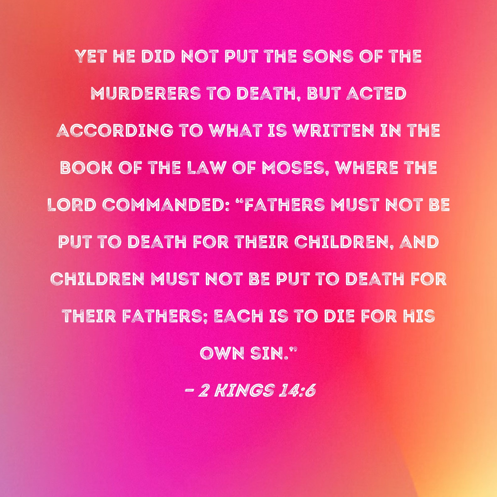 2 Kings 14:6 Yet he did not put the sons of the murderers to death, but acted according to what is written in the Book of the Law of Moses, where the LORD commanded: "Fathers must not be put to death for their children, and children must not be put to death for their fathers; each is to die for his own sin."