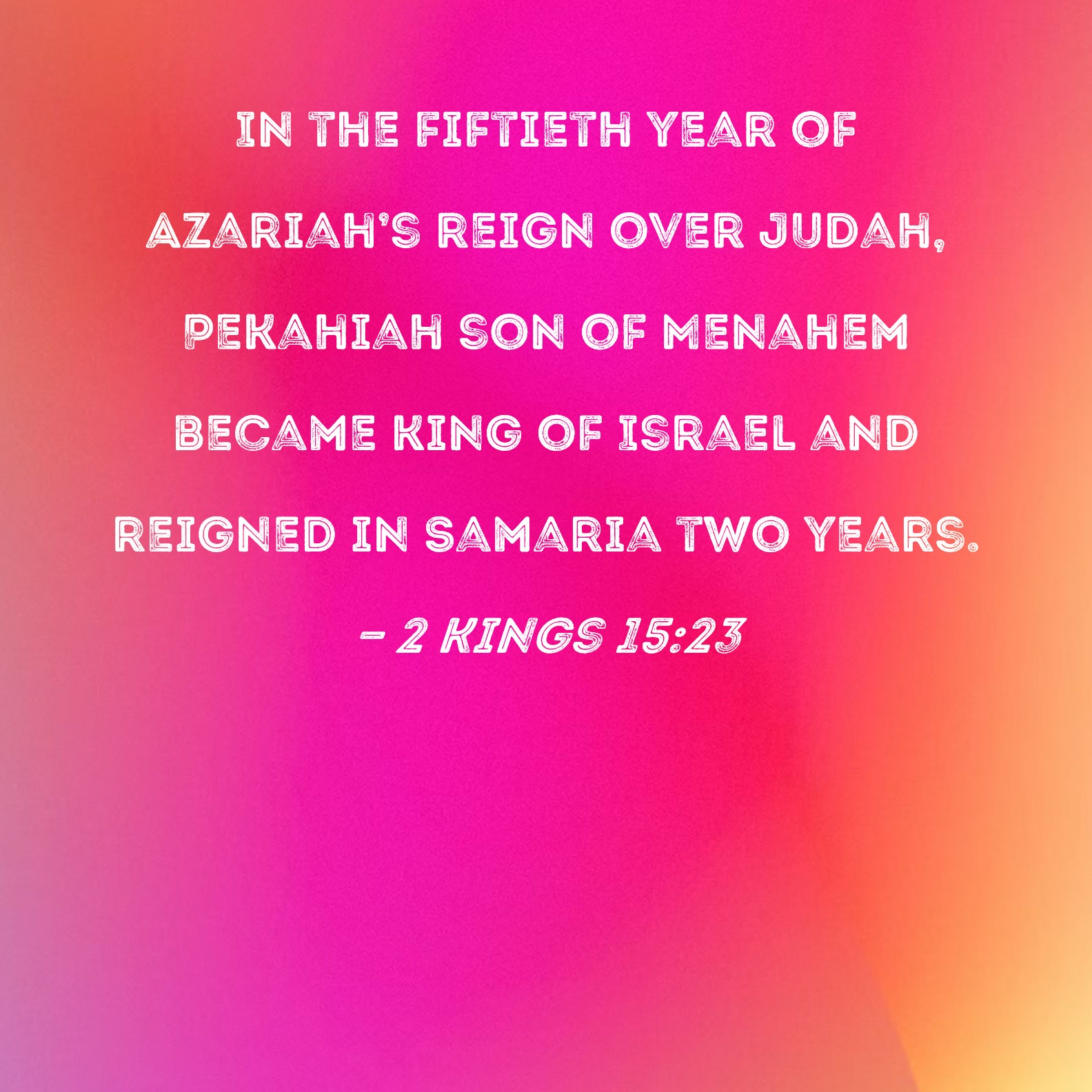 2 Kings 15:23 In the fiftieth year of Azariah's reign over Judah, Pekahiah son of Menahem became king of Israel and reigned in Samaria two years.