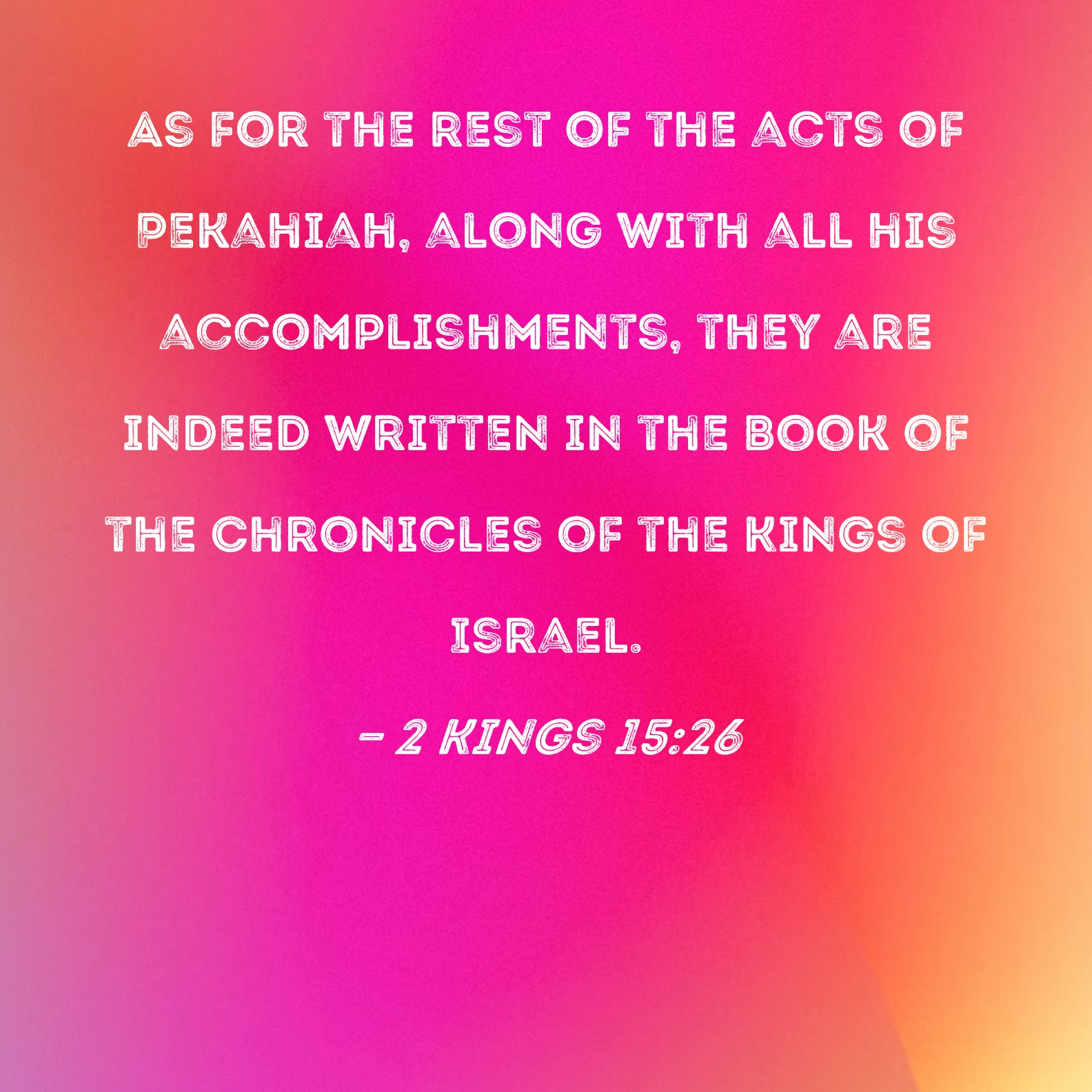 2 Kings 15:26 As for the rest of the acts of Pekahiah, along with all his accomplishments, they are indeed written in the Book of the Chronicles of the Kings of Israel.