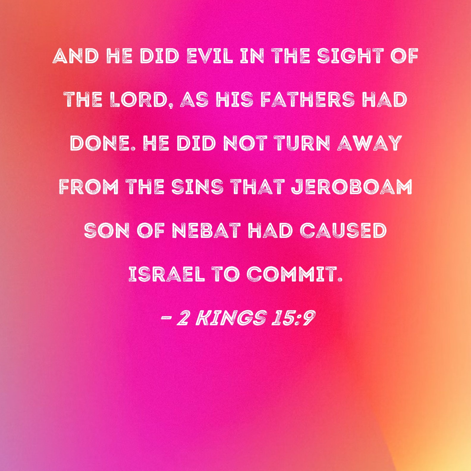 2 Kings 15:9 And he did evil in the sight of the LORD, as his fathers had done. He did not turn away from the sins that Jeroboam son of Nebat had caused Israel to commit.