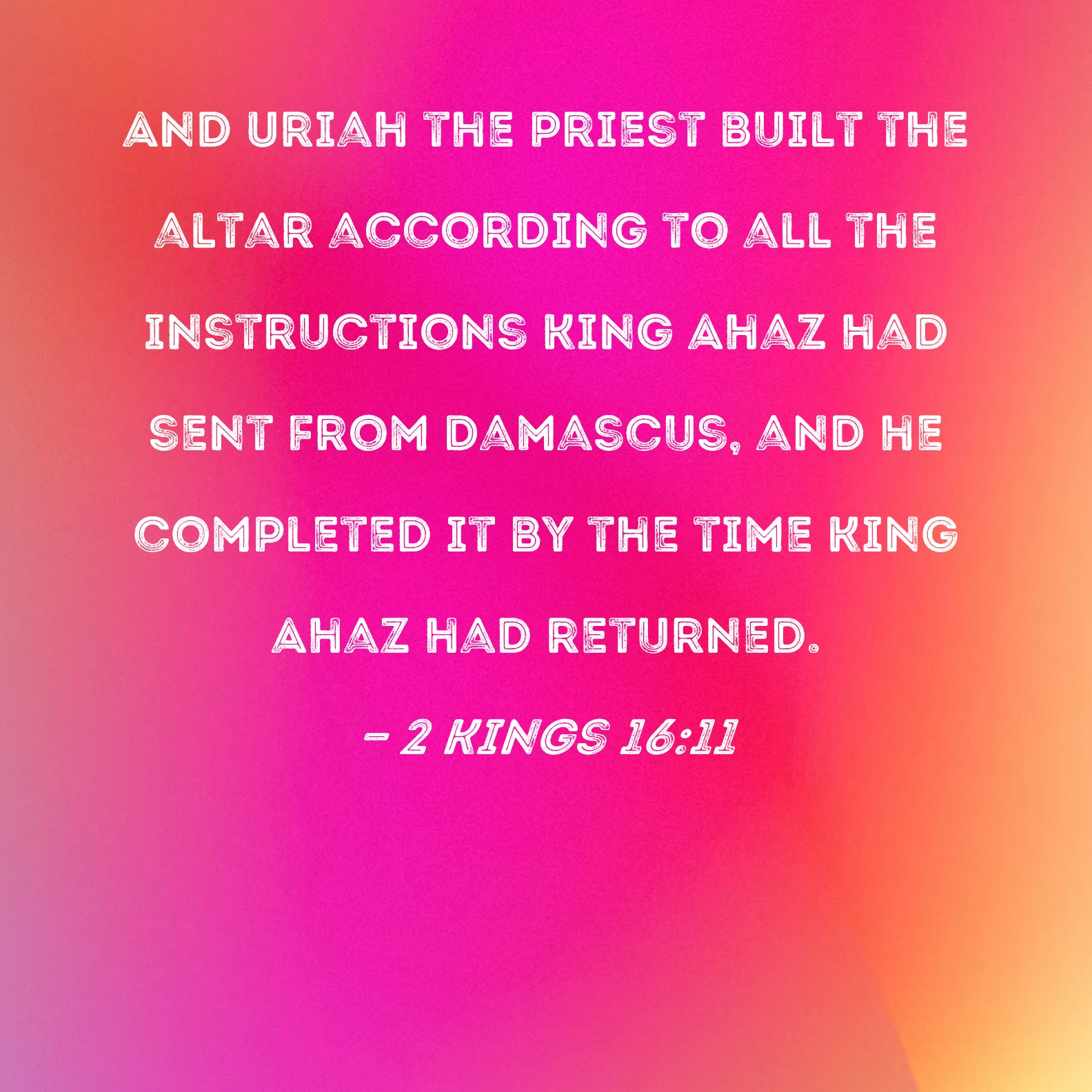 2 Kings 16:11 And Uriah the priest built the altar according to all the instructions King Ahaz had sent from Damascus, and he completed it by the time King Ahaz had returned.