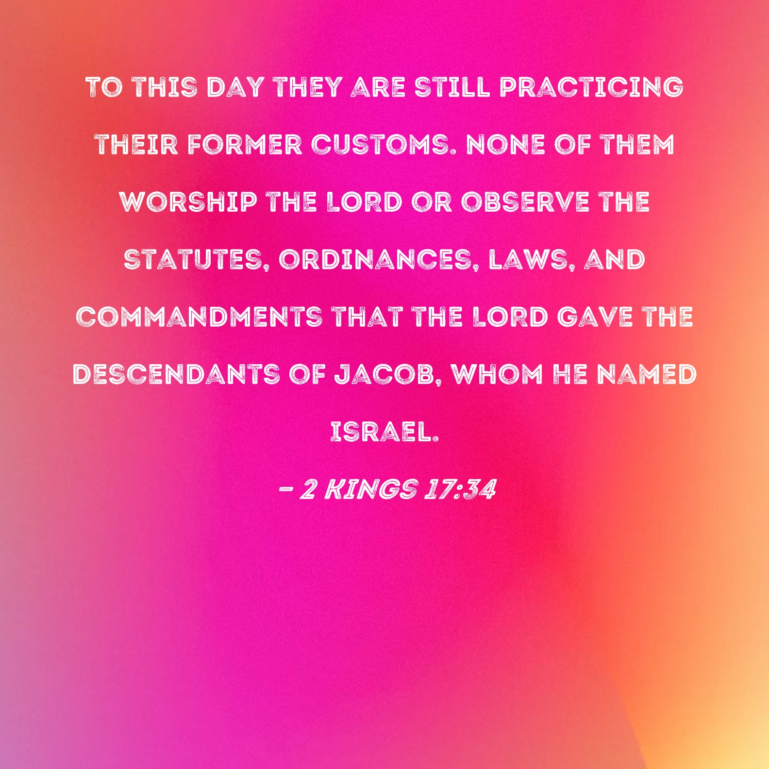 2 Kings 17:34 To this day they are still practicing their former customs. None of them worship the LORD or observe the statutes, ordinances, laws, and commandments that the LORD gave the descendants of Jacob, whom He named Israel.