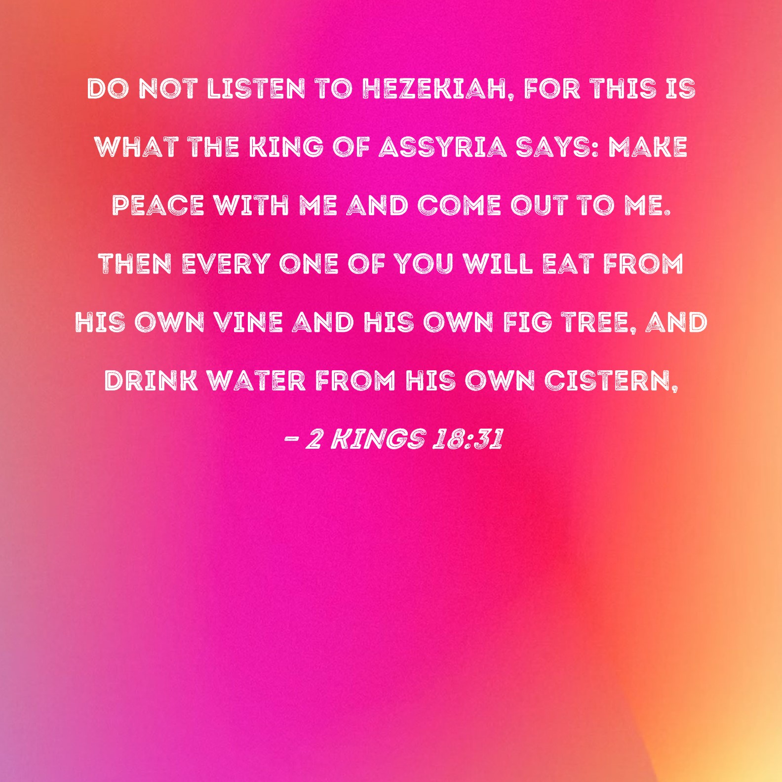 BSB: Do not listen to Hezekiah, for this is what the king of Assyria says: Make peace with me and come out to me. Then every one of you will eat from his own vine and his own fig tree, and drink water from his own cistern, KJV: Hearken not to Hezekiah: for thus saith the king of Assyria, Make an agreement with me by a present, and come out to me, and then eat ye every man of his own vine, and every one of his fig tree, and drink ye every one the waters of his cistern: DRB: Do not hearken to Ezechias. For thus saith the king of the Assyrians: Do with me that which is for your advantage, and come out to me: and every man of you shall eat of his own vineyard, and of his own fig tree: and you shall drink water of your own cisterns, DBT: Hearken not to Hezekiah; for thus says the king of Assyria: Make peace with me, and come out to me; and eat every one of his vine and every one of his fig-tree, and drink every one the waters of his own cistern; ERV: Hearken not to Hezekiah: for thus saith the king of Assyria, Make your peace with me, and come out to me; and eat ye every one of his vine, and every one of his fig tree, and drink ye every one the waters of his own cistern; WBT: Hearken not to Hezekiah: for thus saith the king of Assyria, Make an agreement with me by a present, and come out to me, and then eat ye every man of his own vine, and every one of his fig-tree, and drink ye every one the waters of his cistern: WEB: Don’t listen to Hezekiah.’ For the king of Assyria says, ‘Make your peace with me, and come out to me; and everyone of you eat from his own vine, and everyone from his own fig tree, and everyone drink water from his own cistern; YLT: 'Do not hearken unto Hezekiah, for thus said the king of Asshur, Make with me a blessing, and come out unto me, and eat ye each of his vine, and each of his fig-tree, and drink ye each the waters of his own well,Links 2 Kings 18:31 NIV • 2 Kings 18:31 NLT • 2 Kings 18:31 ESV • 2 Kings 18:31 NASB • 2 Kings 18:31 KJV • 2 Kings 18:31 Interlinear • 2 Kings 18:31 Commentaries • 2 Kings 18:31 Parallel Texts • 2 Kings 18:31 Bible Apps • 2 Kings 18:31 Parallel • Bible Hub |