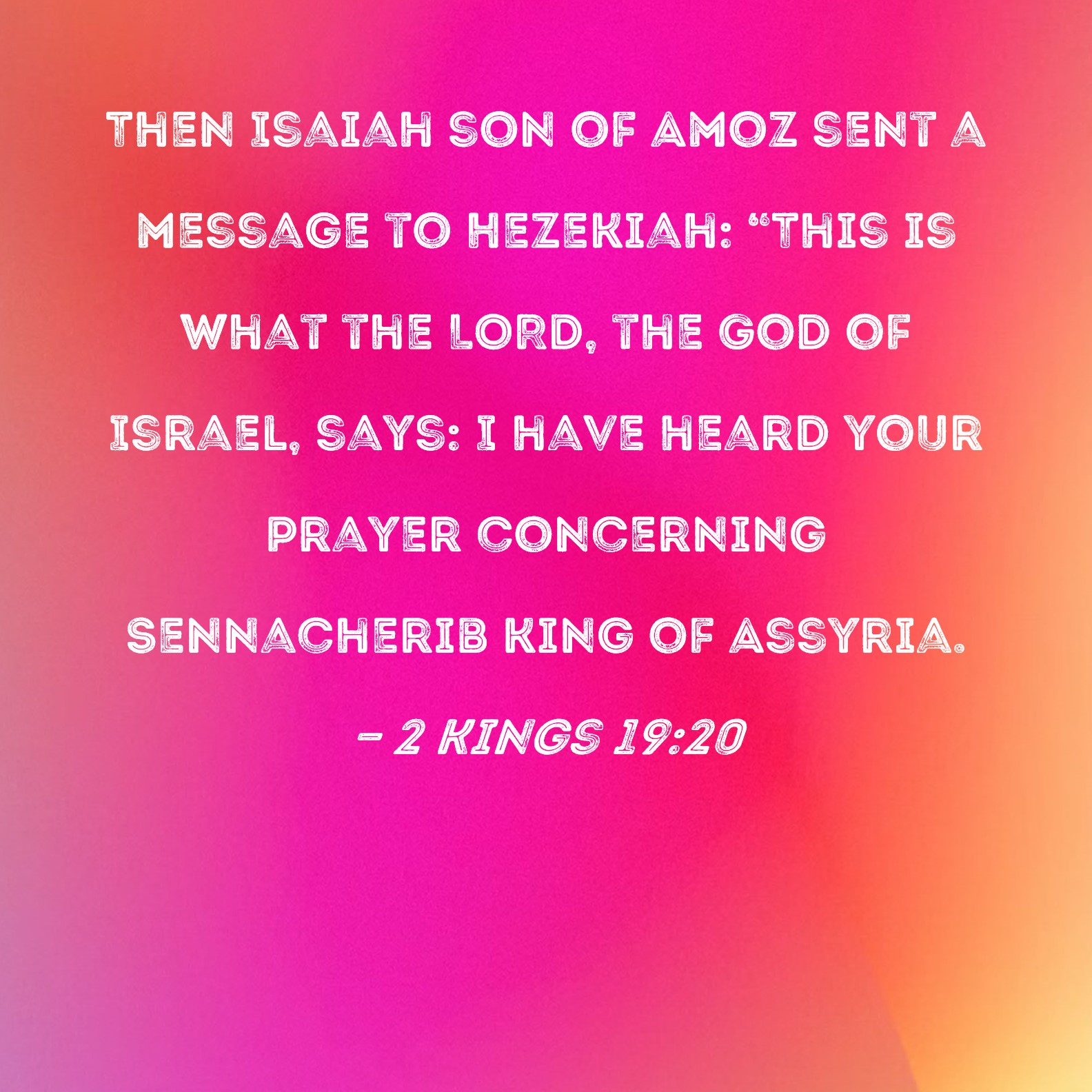 2 Kings 19:20 Then Isaiah son of Amoz sent a message to Hezekiah: "This is what the LORD, the God of Israel, says: I have heard your prayer concerning Sennacherib king of Assyria.