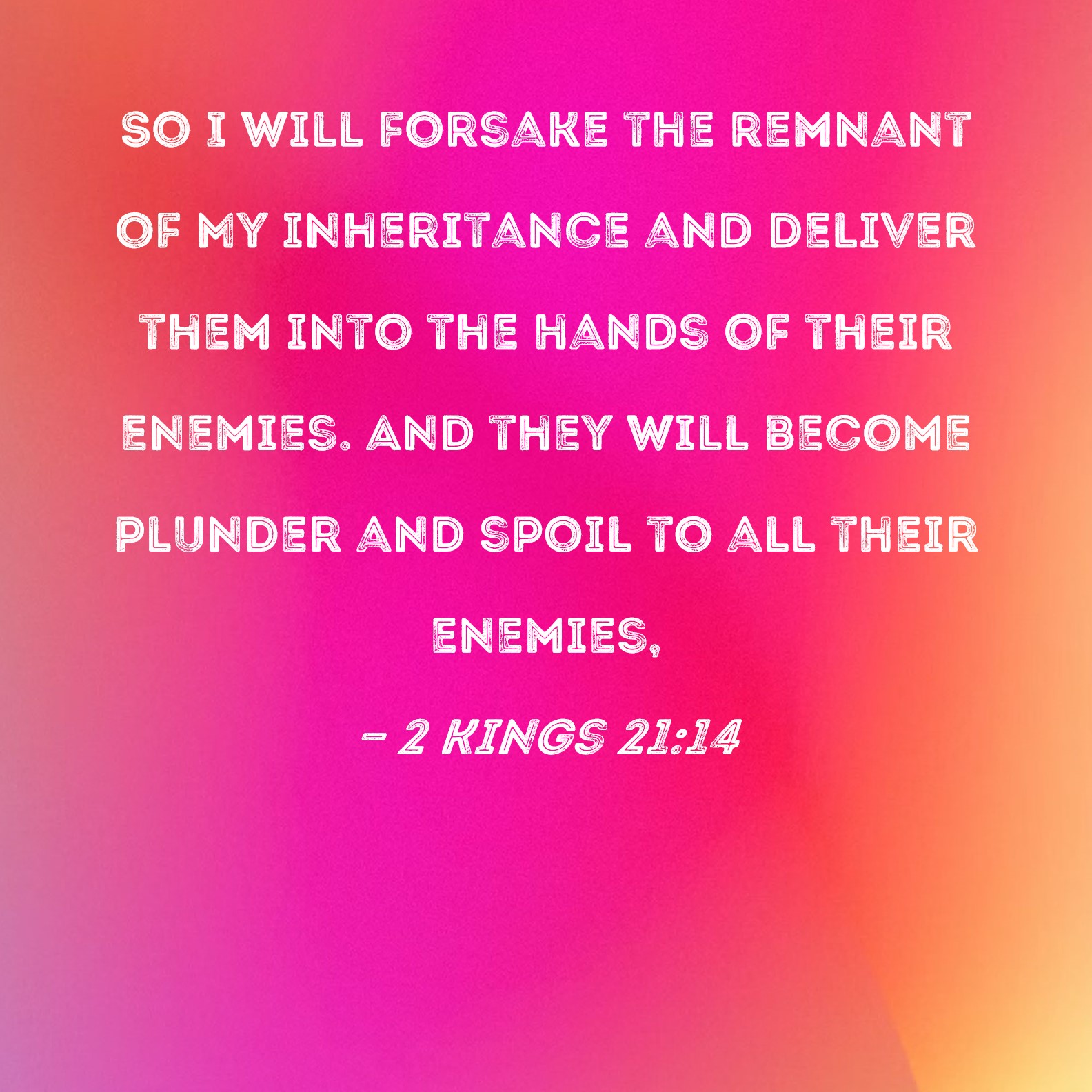 2 Kings 21:14 So I will forsake the remnant of My inheritance and deliver them into the hands of their enemies. And they will become plunder and spoil to all their enemies,
