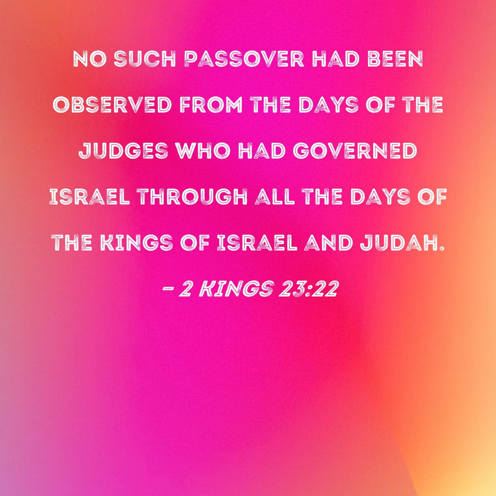 2 Kings 23:22 No such Passover had been observed from the days of the judges who had governed Israel through all the days of the kings of Israel and Judah.